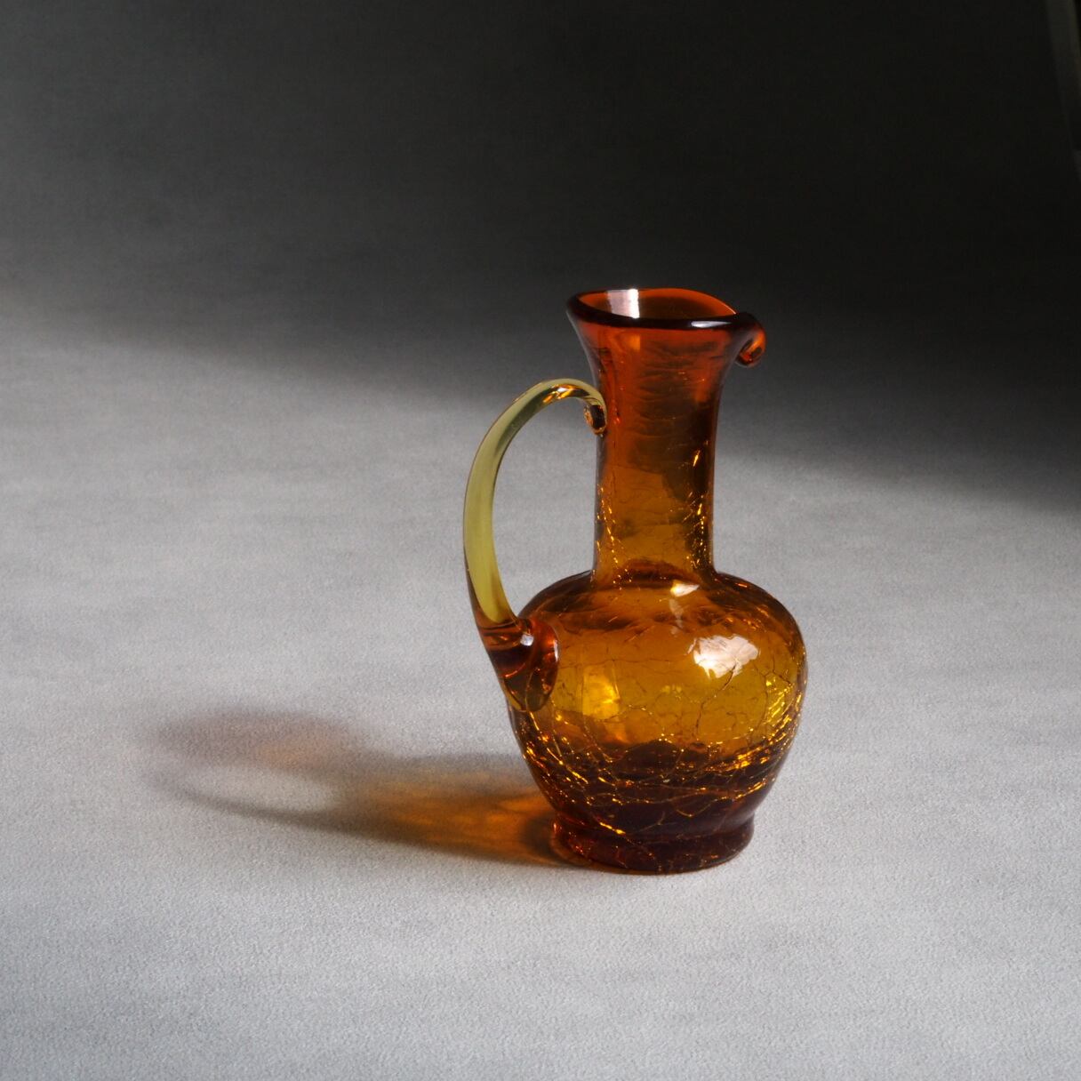 少しオレンジがかったアンバーの色合いが魅力の小さなフラワーベース。crackle glassの輝きがより一層美しさを引き立てます。適度な重さで安定感もあります。ギフトにもオススメな1点です。