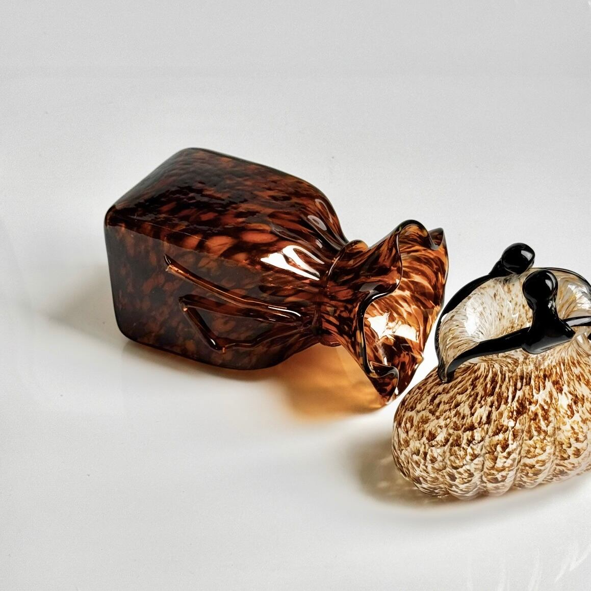 1980年代のアメリカで製作されたガラス製フラワーベース。リボンを結んだギフトバッグのようなフォルムと鼈甲を思わせる深みのあるマーブルブラウンが印象的な1点。内側をよく見るとわずかにラメが入ったような美しい色合いになっています。ミッドセンチュリー以降のアートガラス工房が得意としたスタイルです。光の加減でマーブル模様が豊かに表情を変えて見せてくれる為、オブジェとしても空間のいいアクセントに。花器としても重宝する程よいサイズ感も魅力です。