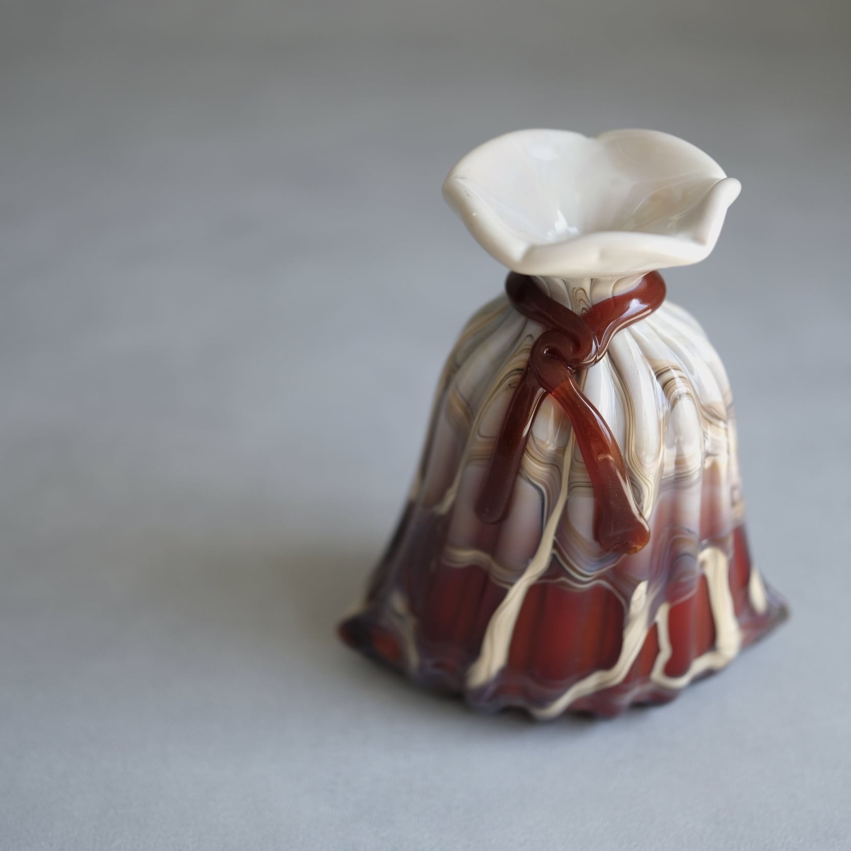 人気の巾着型シリーズのガラス製フラワーベース。珍しい色合いとガラスならではの美しい艶感が魅力の1点。インパクトのあるデザインはオブジェとしてはもちろん、お花も飾りやすいフォルムとサイズ感です。