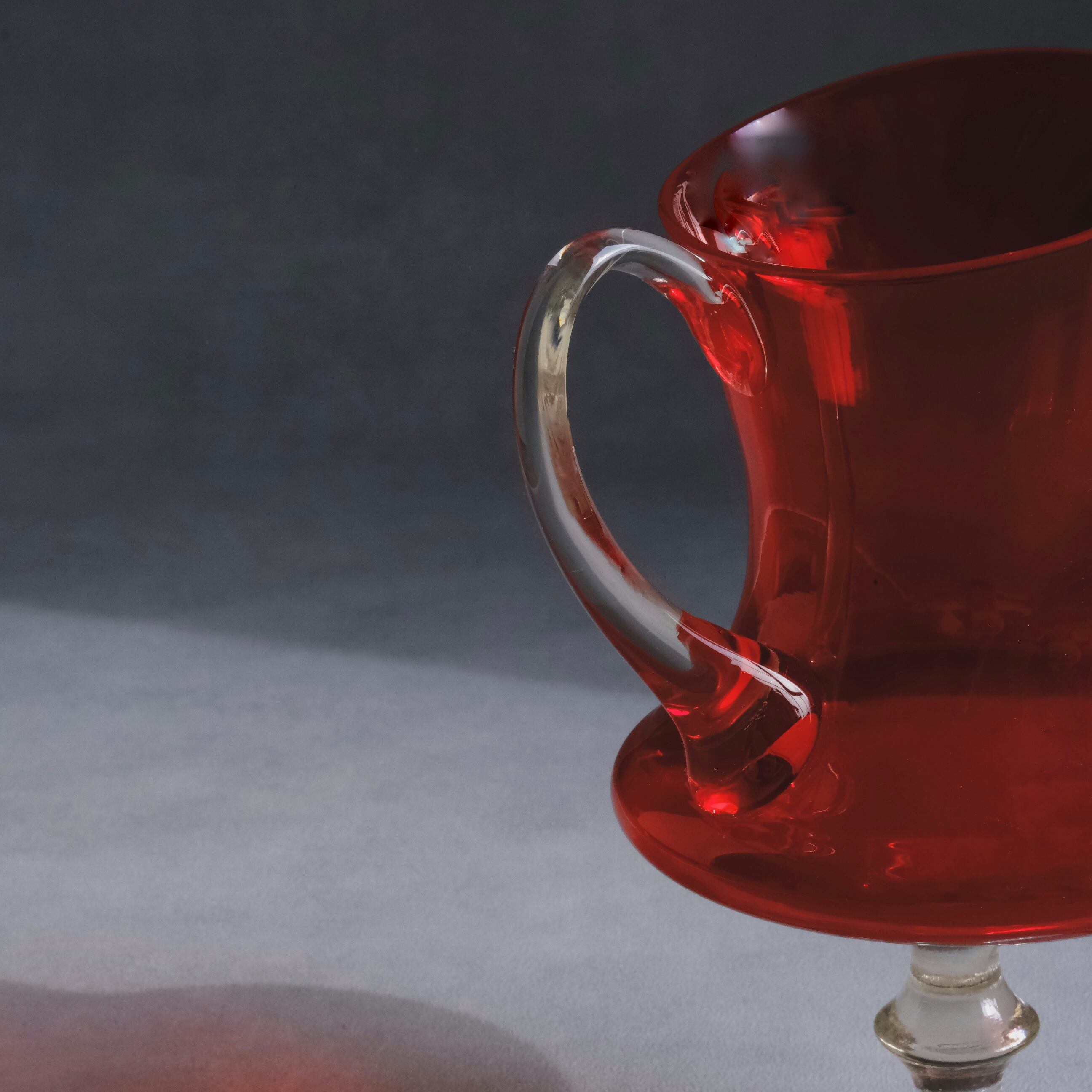 鮮やかな深紅のボディに、透明なステムとハンドルを組み合わせた、イタリア・エンポリ地方で制作されたヴィンテージのガラス製ピッチャー。1960年代に盛んに作られたスタイルで、華やかさとエレガンスを兼ね備えたデザインです。口が広いデザインなのでばさっとシンプルにお花を活けるのも素敵です。空間を鮮やかに彩ってくれる存在感のある一点です。