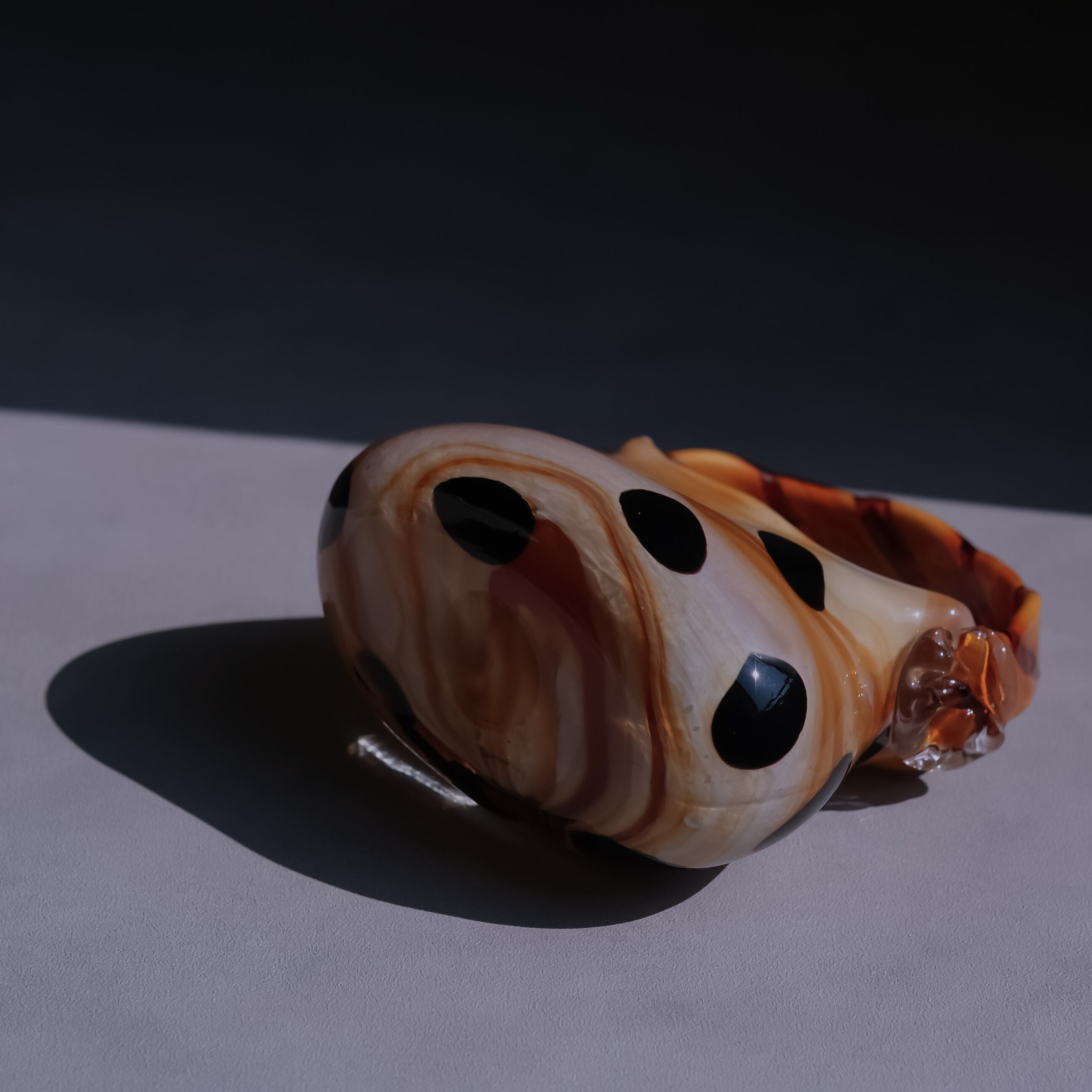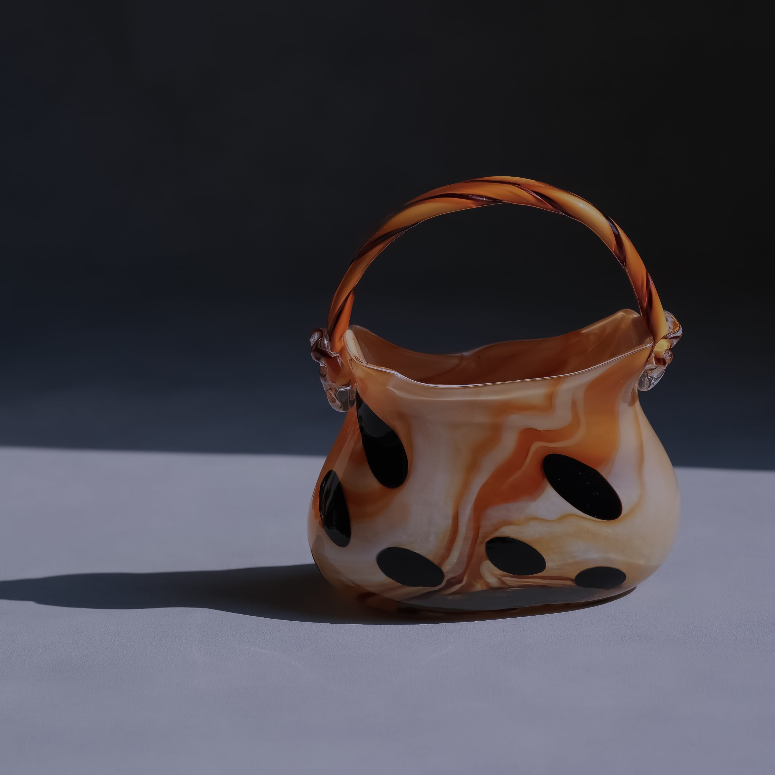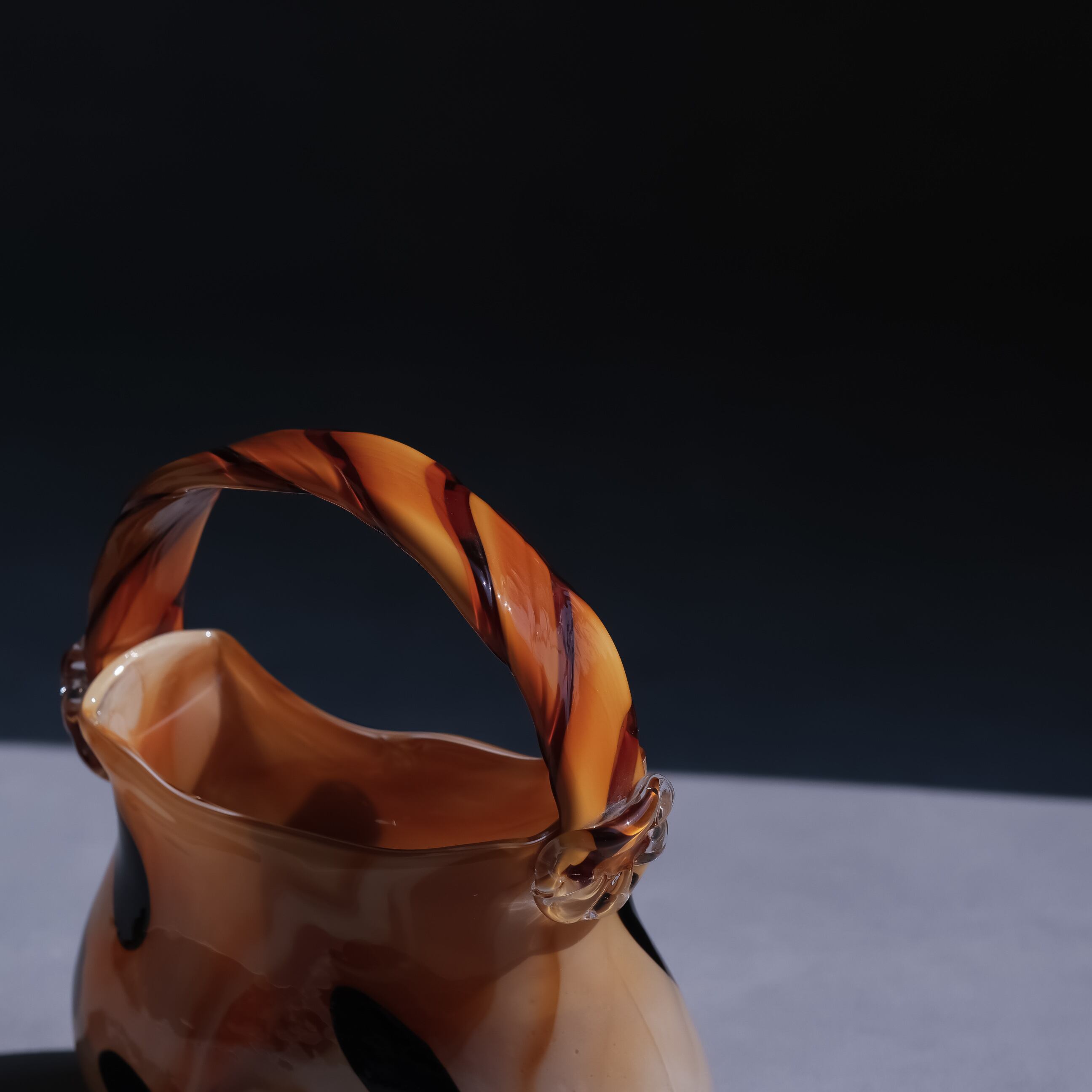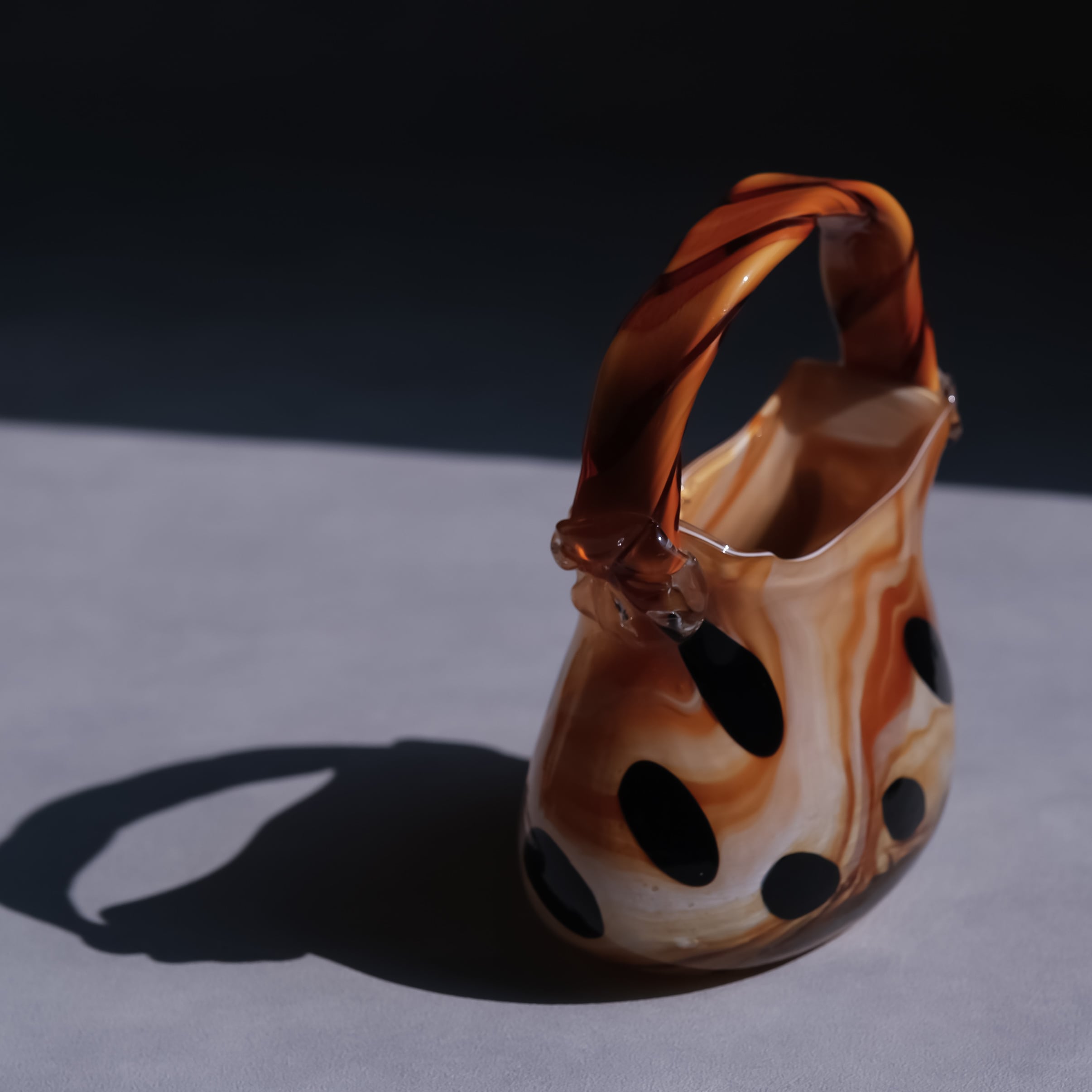 イタリア、ムラーノ島のガラス職人によって手作業で生み出されたアートガラス。ハンドルやボタン部分など、ガラスで作られたとは思えない細部へのこだわりが魅力です。ずっしりと厚みのあるガラスで作られている為、安定感もあります。花器としての使用も可能ですが、ただ飾るだけでも一際存在感を放つ1点。大切な人への贈り物に、自分へのご褒美に。