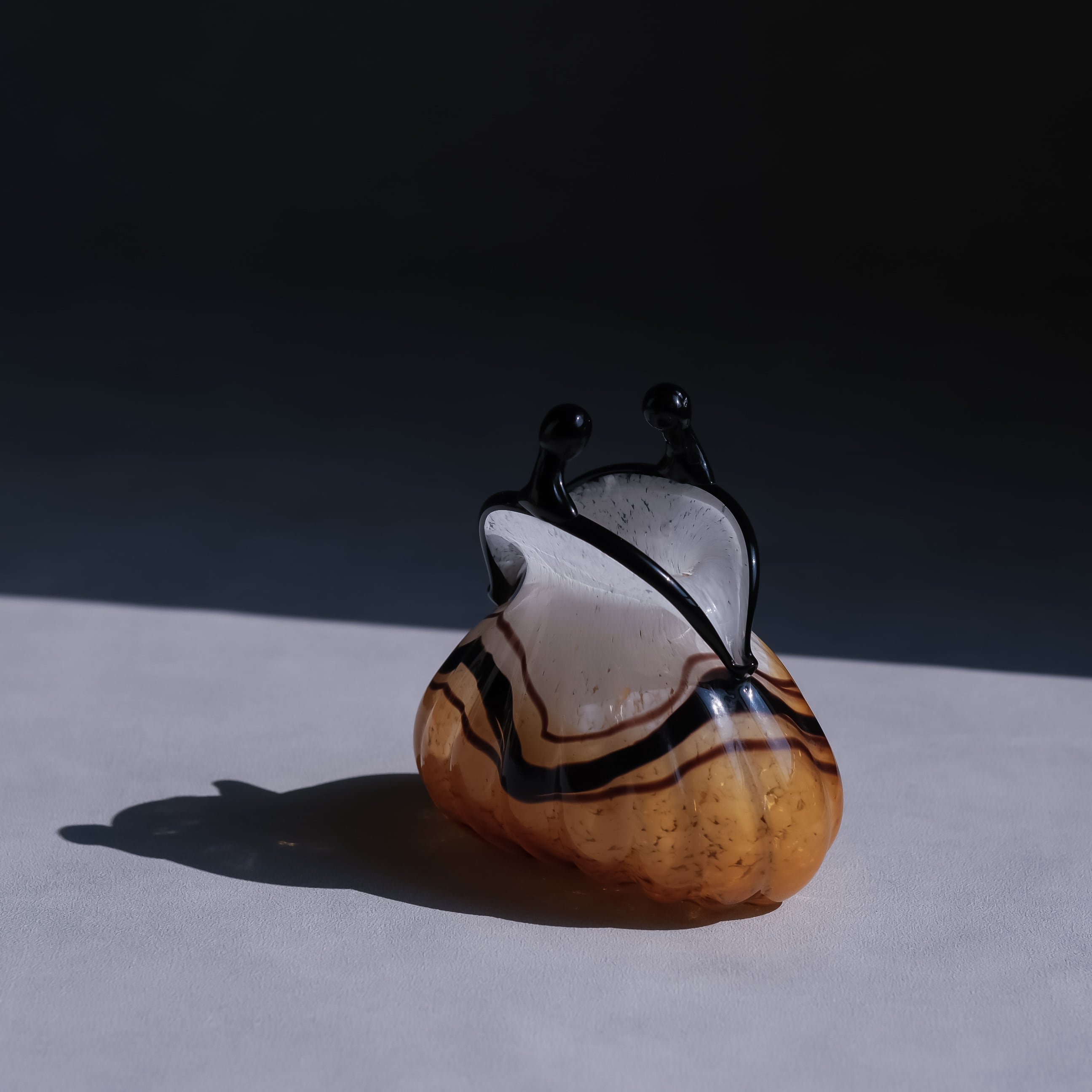 1950〜1970年代頃のイタリア・ヴェネチアのムラーノ諸島で制作されたアートガラスのフラワーベース。透け感のあるホワイトとアンバーのガラスにブラックのアクセントが効いたレトロな雰囲気の1点。長年大切にコレクションされてきたと感じられるとても良好なコンディションです。
