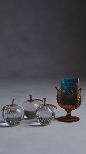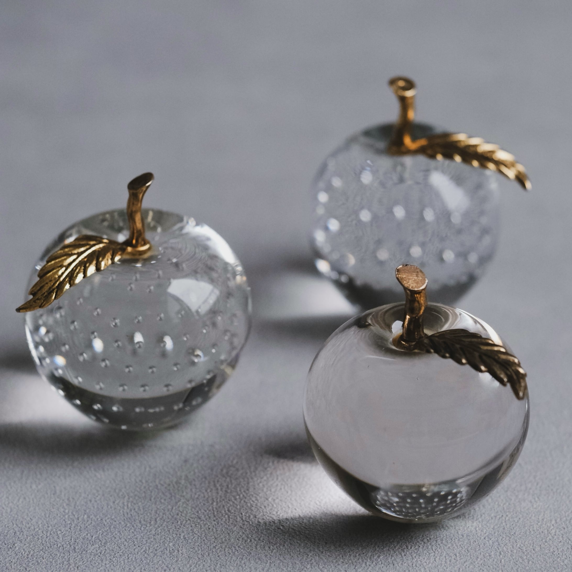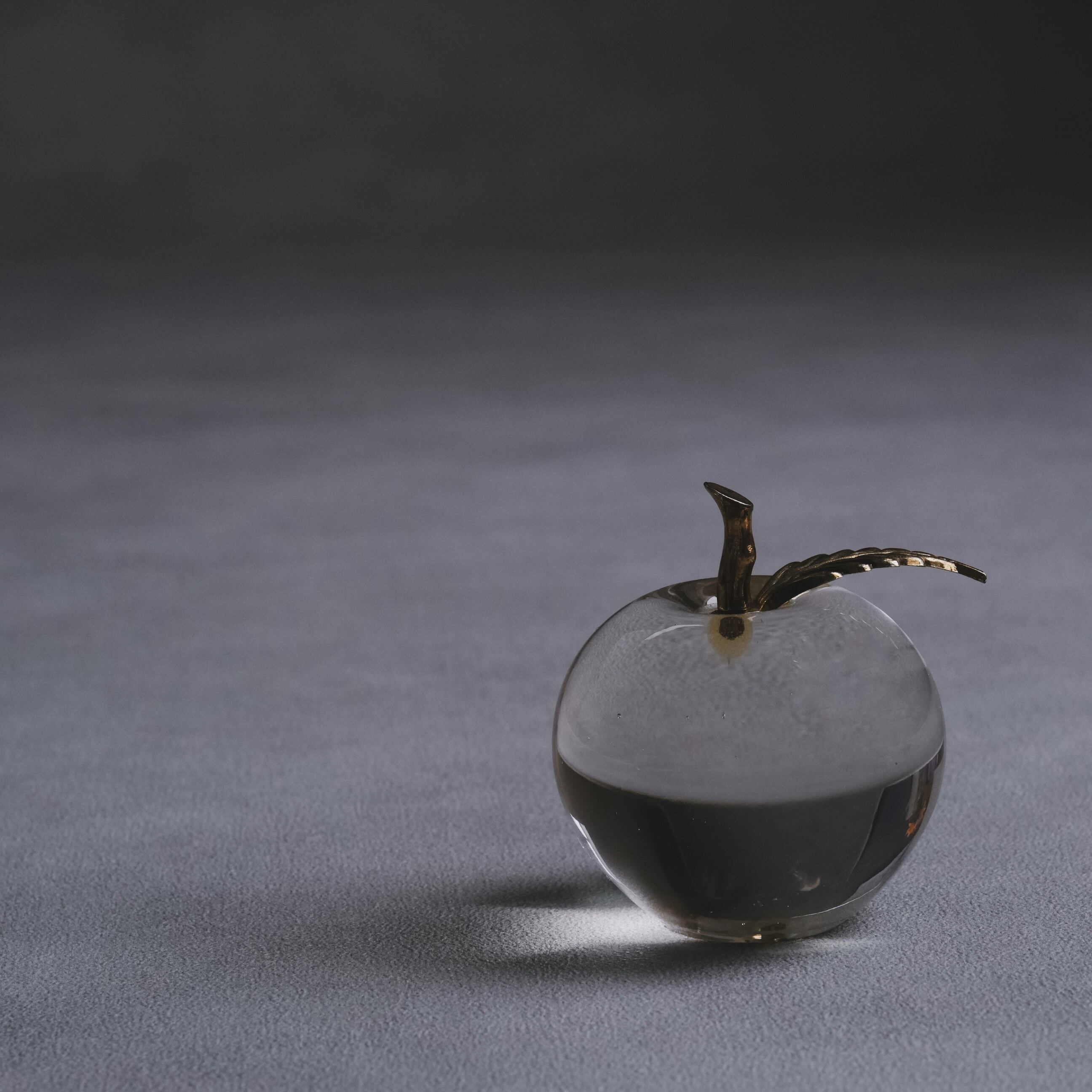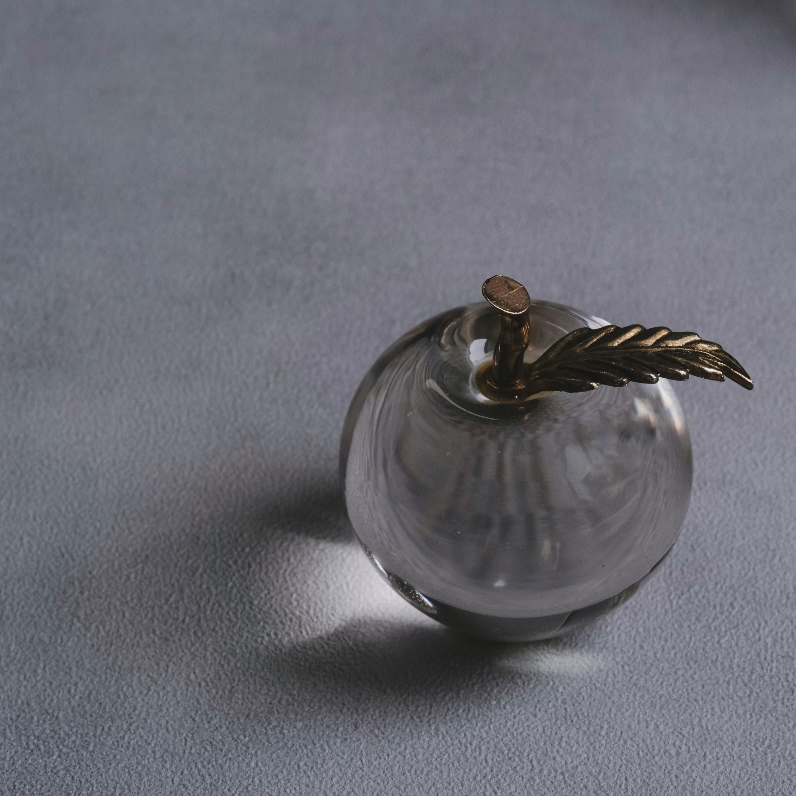 真鍮の葉が付いたガラス製のりんご型ペーパーウェイト。水晶のようなガラスの透明感に真鍮のアクセントが雰囲気のある1点。ショップやサロン用のオブジェとしてもお勧めです。