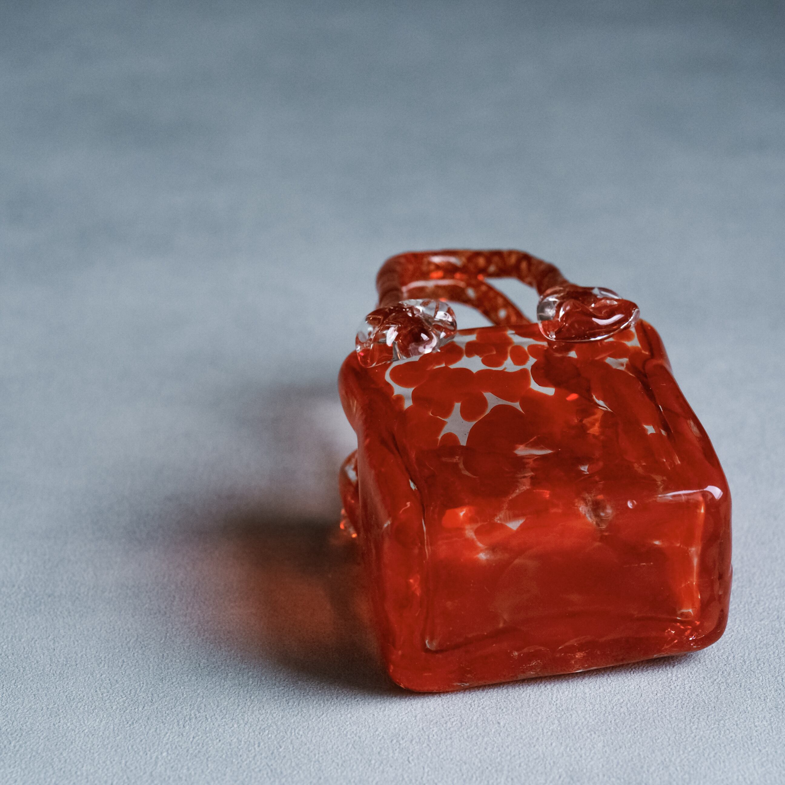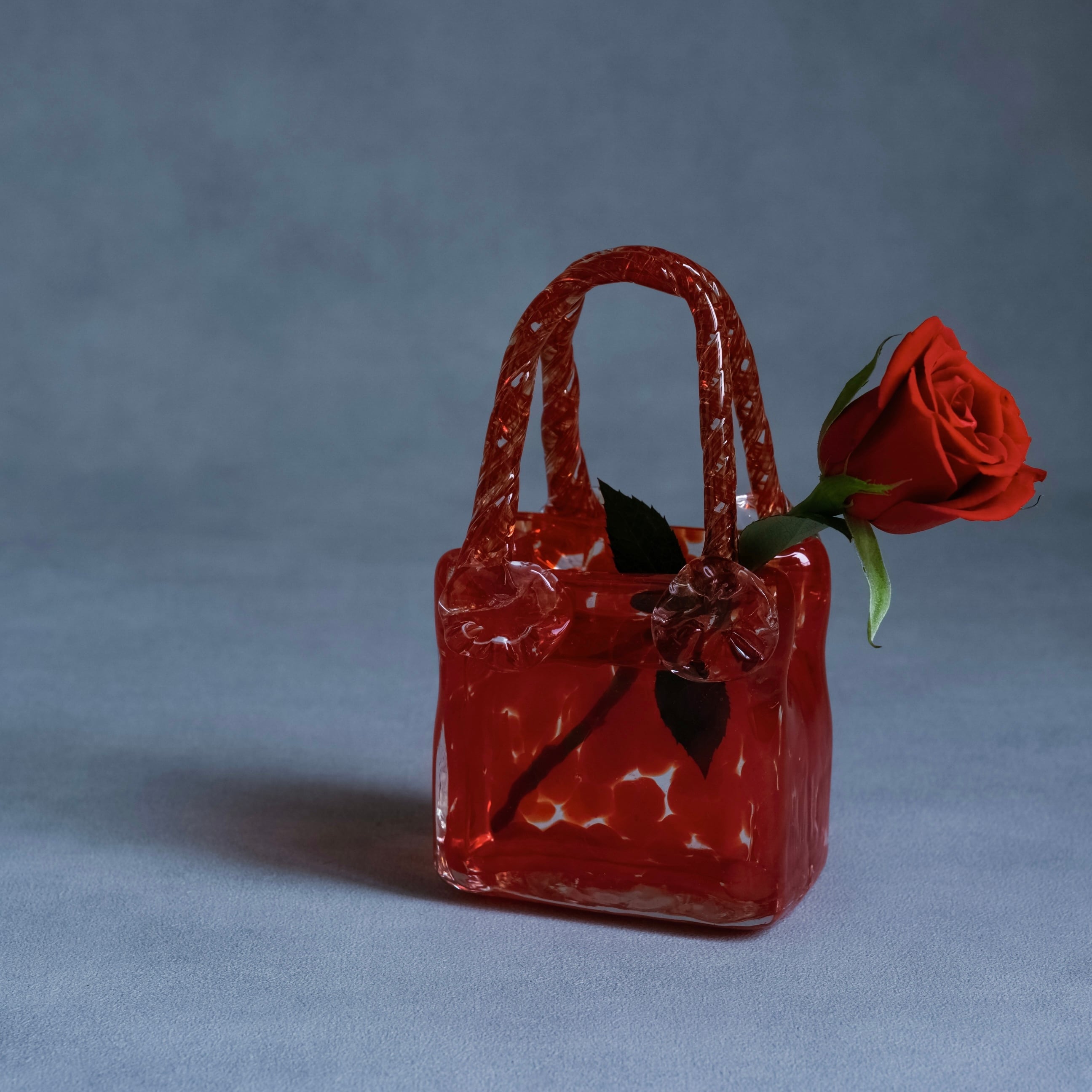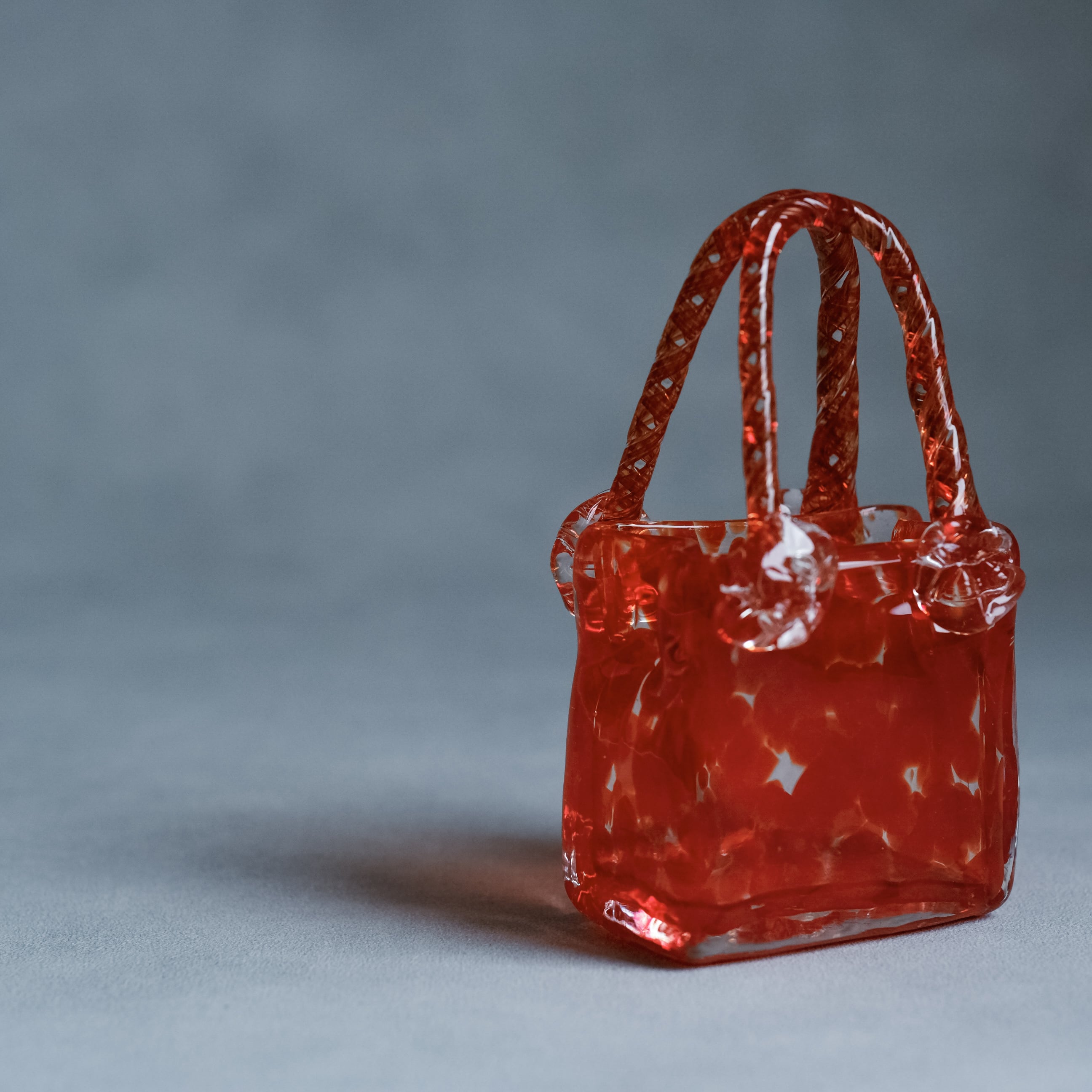 ハンドバッグ型の小さなガラス製フラワーベース。ずっしりと分厚いガラスで作られています。コンパクトなサイズ感ですが、安定感があります。オブジェとしても、小さな花器としても。