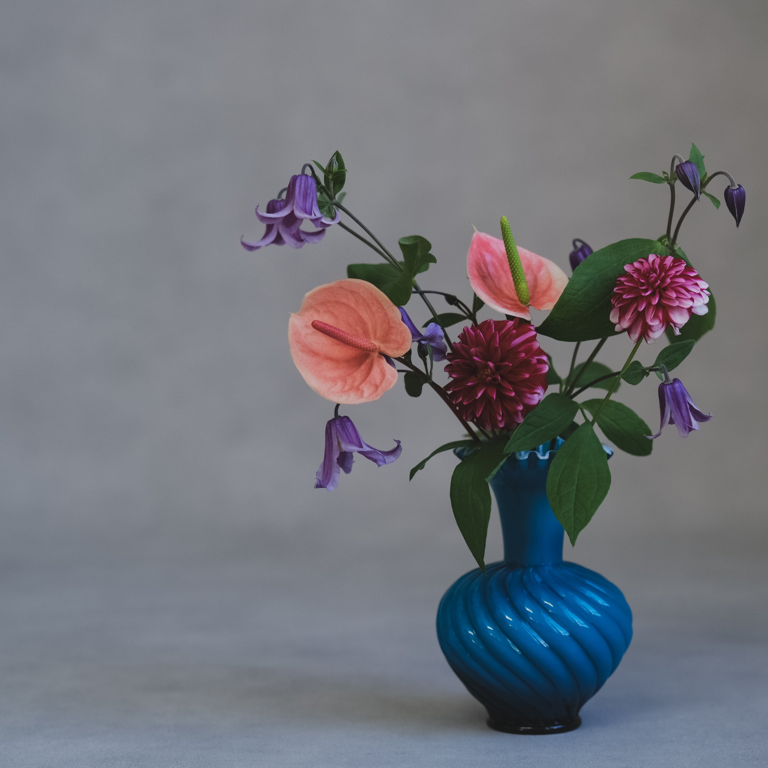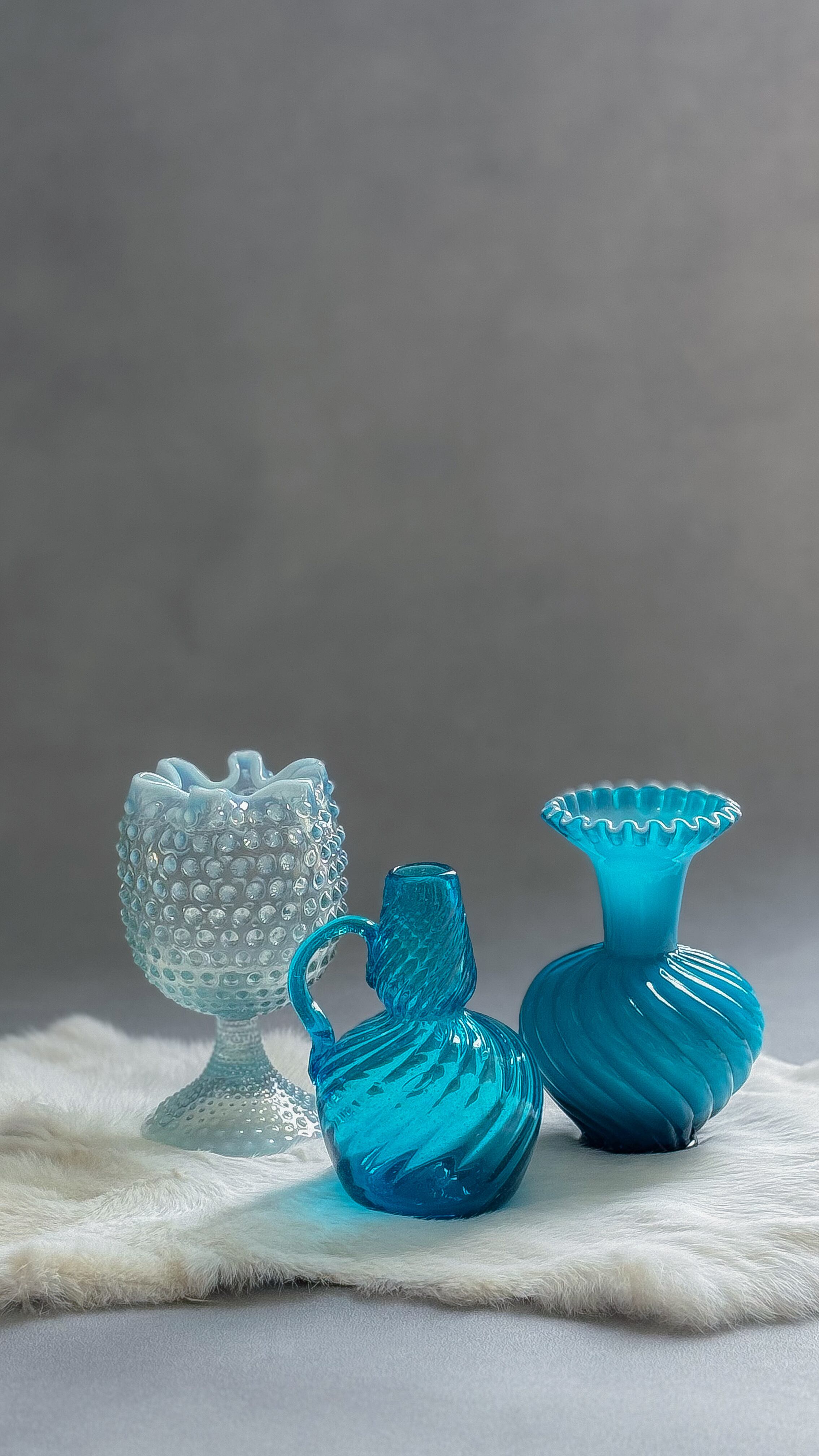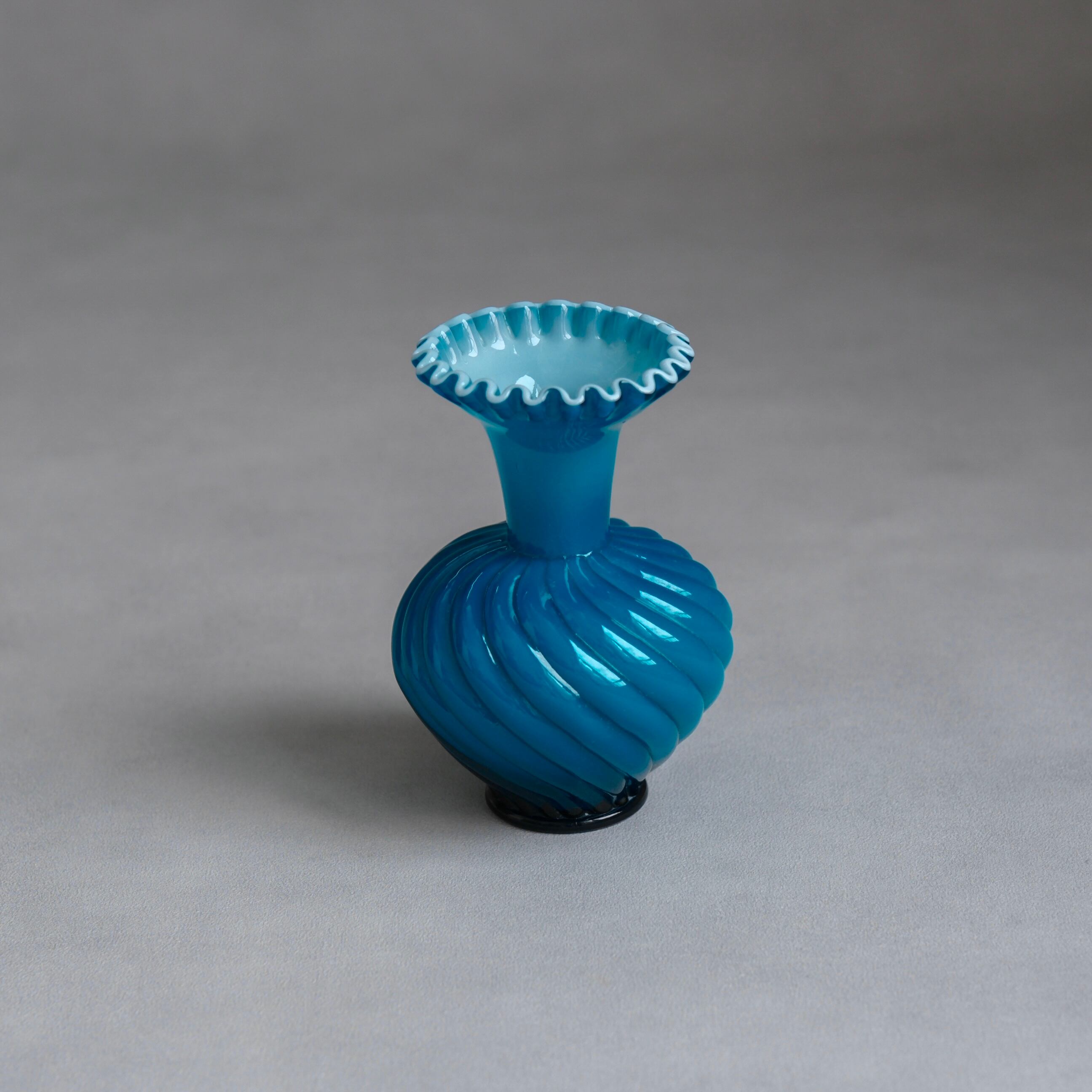 Fentonならではのスワール(渦巻き状の)デザインと口縁のフリルデザイン、そして色鮮やかなターコイズブルーが美しいガラス製フラワーベース。使いやすい手頃なサイズ感は花器としても重宝しますが、まさにヴィンテージらしい色合いと華やかな佇まいはオブジェとしても。
