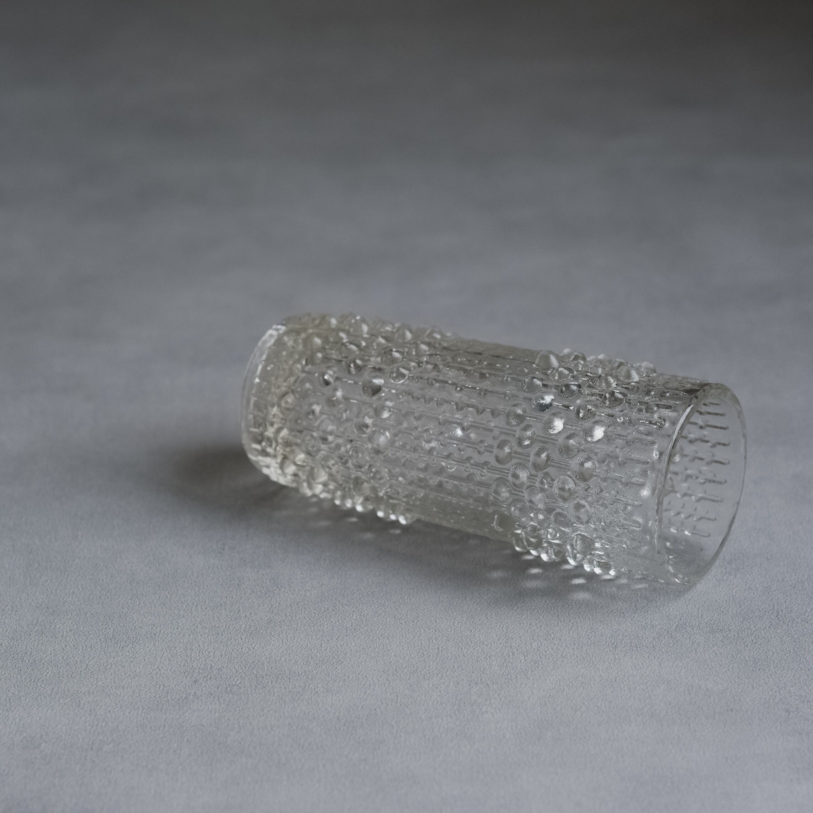 チェコスロバキアのミッドセンチュリーデザイン界を牽引した巨匠、František Pečený が、Hermanova Huť 社のためにデザインしたヴィンテージのプレスガラス花瓶。まるで水の泡ような立体的なレリーフは、光を多方向に拡散し、見る角度や光の当たり方によって、ガラスの透明感と輝きが美しく変化します。シンプルながらも力強いフォルムと、独特なテクスチャのコントラストは空間の良いアクセントになりそう。