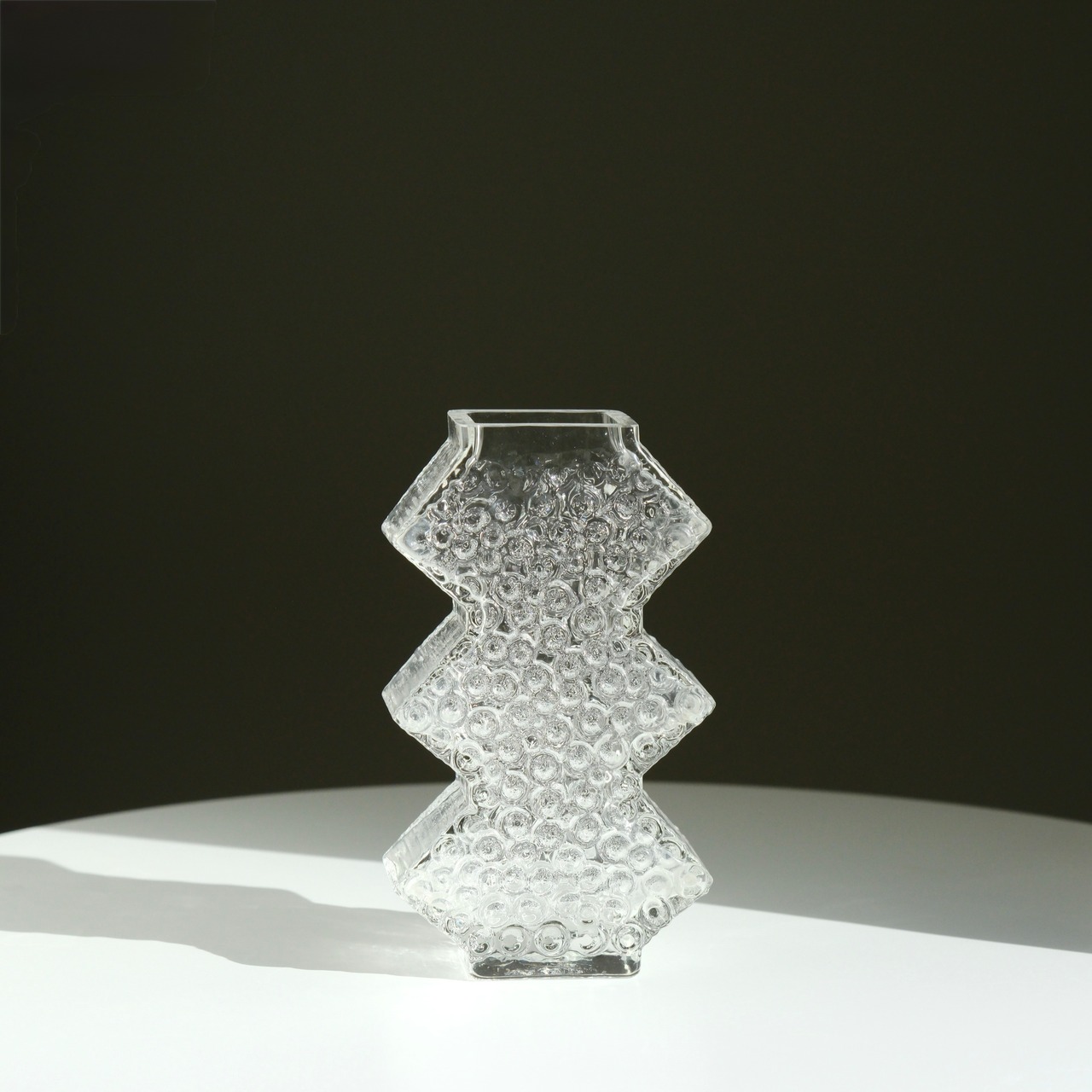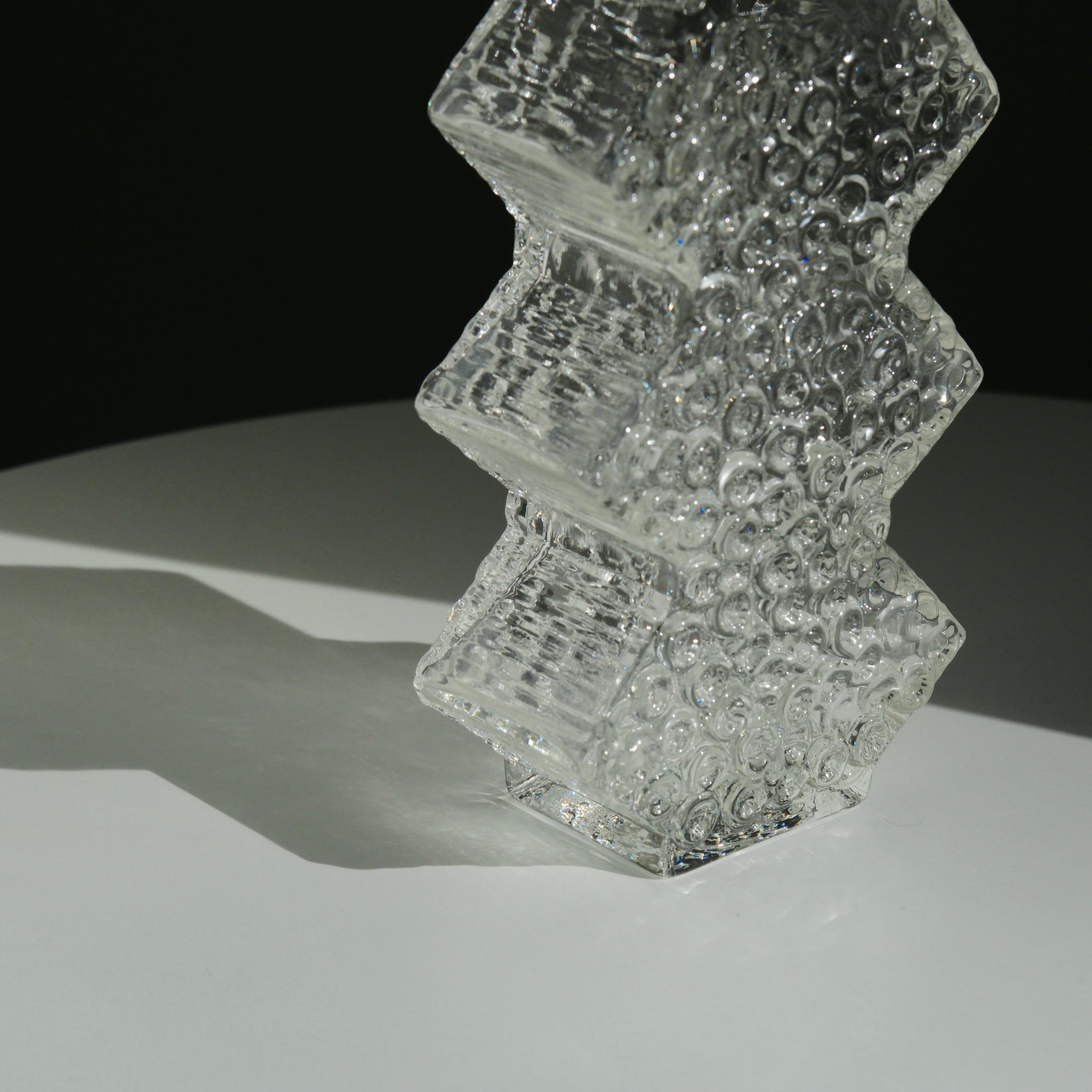 スウェーデンの名工房Smålandshyttan(スモーランズハイタン)にて、才能溢れるデザイナー、Josef Schott(ヨゼフ・ショット)が1970年代に手がけた、希少なヴィンテージアートガラスのフラワーベース。ジグザグのフォルムがツリーを彷彿させるデザインです。表面には雪や霜を思わせる繊細なガラスの渦巻き状のテクスチャが施されています。光を受けるたびに美しく反射し、氷の結晶のように美しく輝きます。冬時期の花器として枝物をシンプルに飾ったり、勿論単体でオブジェとしても。