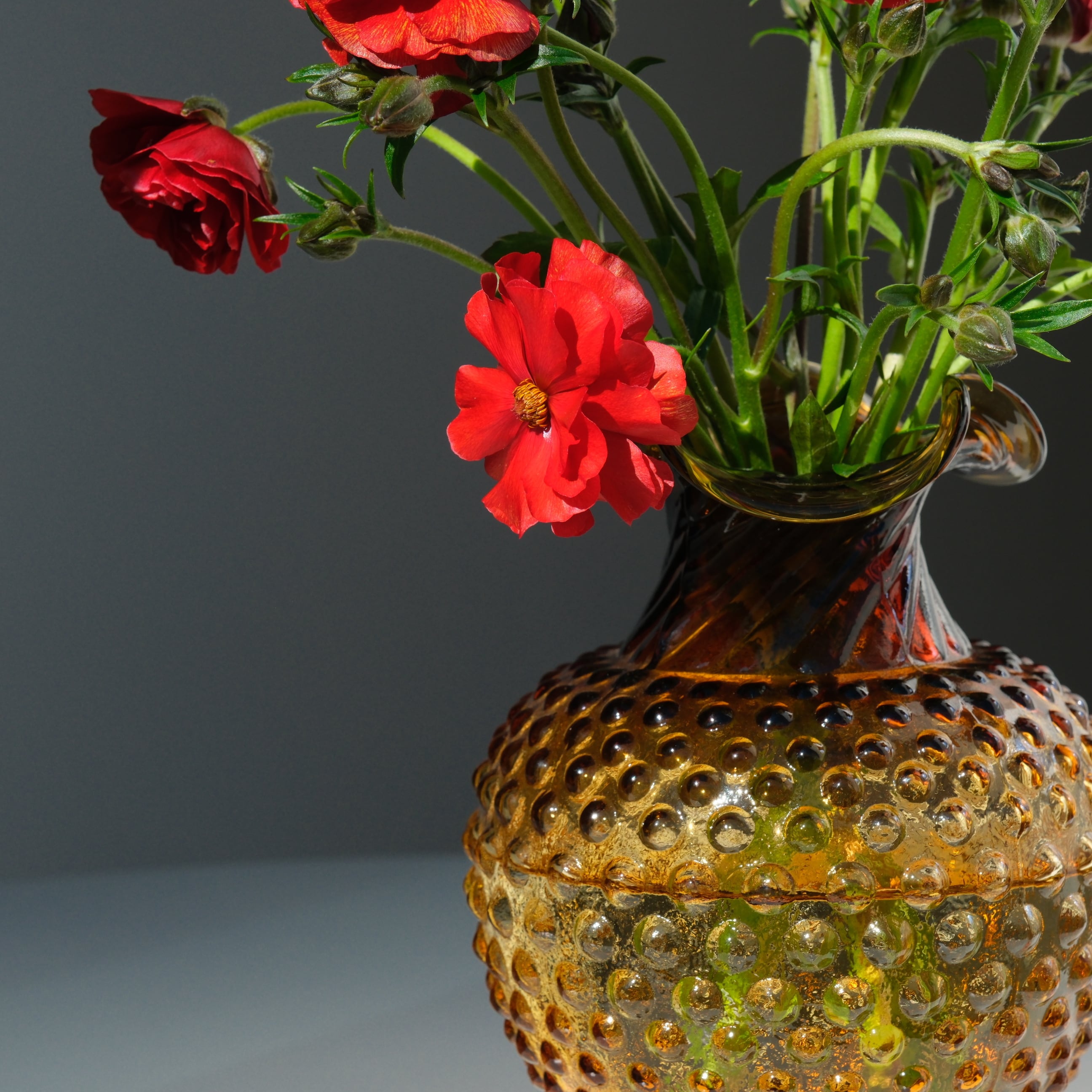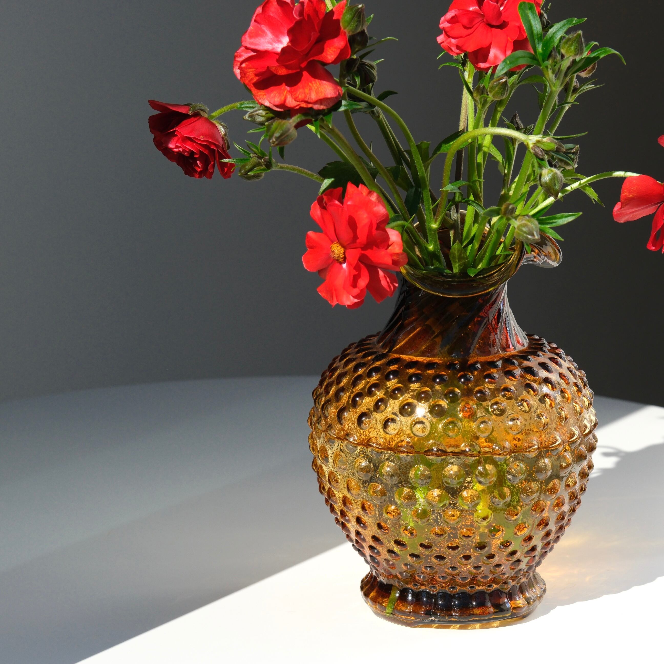 1950年代に制作されたアメリカのIndiana Glass社製のフラワーベース。凹凸のあるホブネイルデザインに濃いめの鼈甲色が美しい佇まいです。ブーケをそのまま飾れそうなサイズ感も魅力。オブジェとしても。