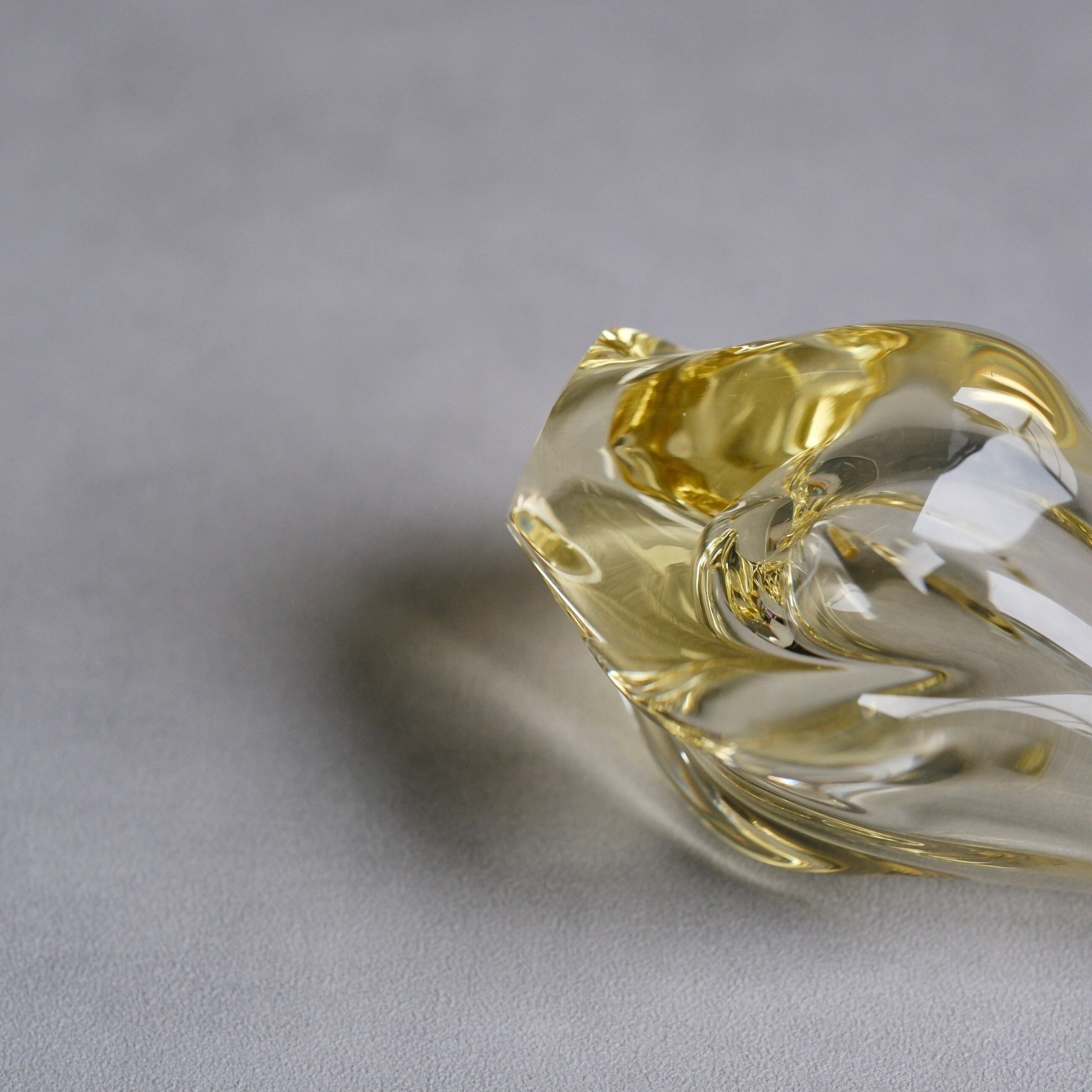 イタリア・ムラーノ島で1950〜60年代頃に制作されたヴィンテージのガラス花瓶。厚みのあるクリスタルガラスに、淡いイエローの色ガラスを重ね、ガラスをねじるように成形された有機的なフォルムが印象的な一品です。光を受けることで生まれる柔らかな陰影と、手仕事ならではの揺らぎが、空間に静かな存在感を与えてくれます。口元はわずかに歪みを残した仕上げで、一輪挿しとしてはもちろん、オブジェとして飾っても美しい佇まい。花を活けない時間も、インテリアのアクセントとしてお楽しみいただけます。