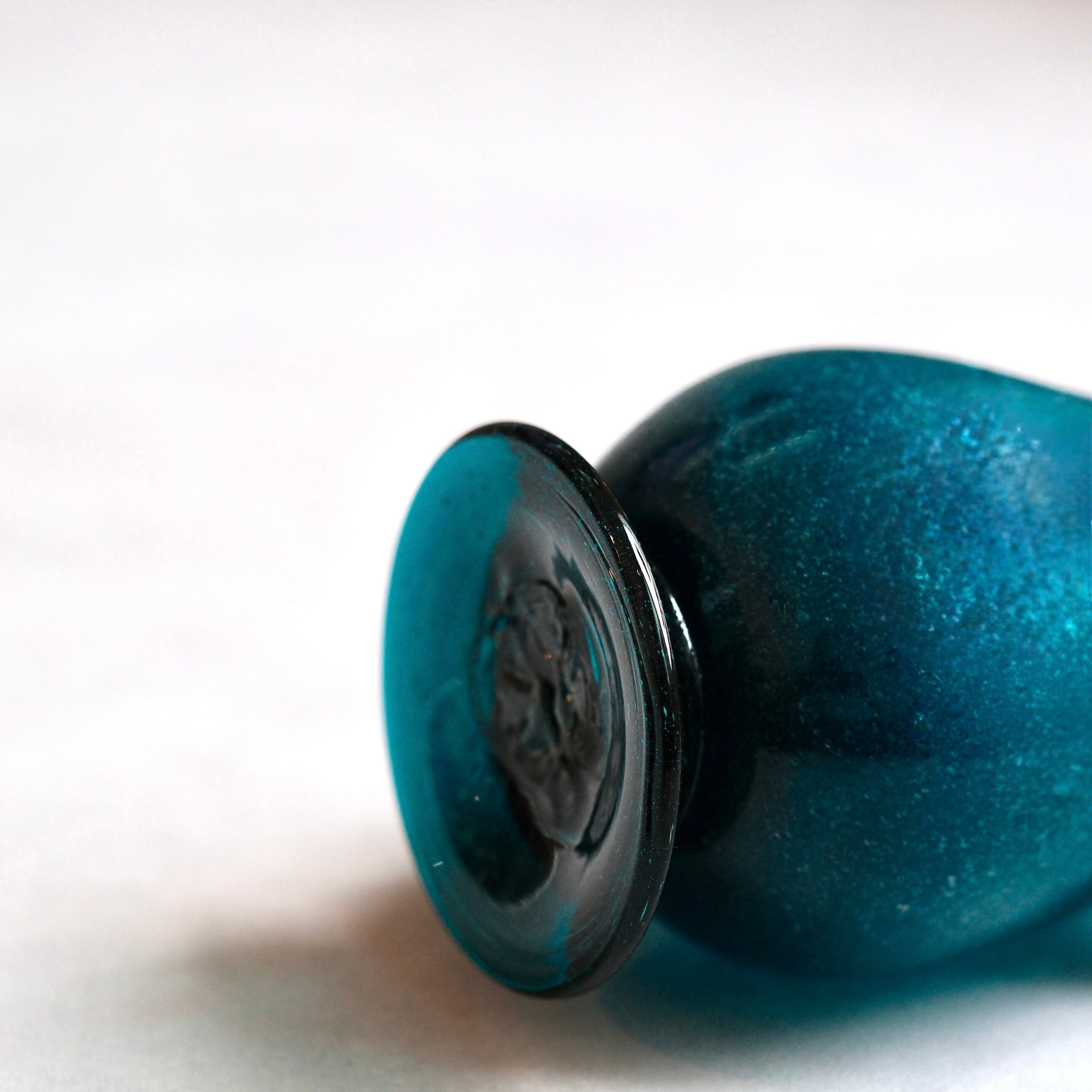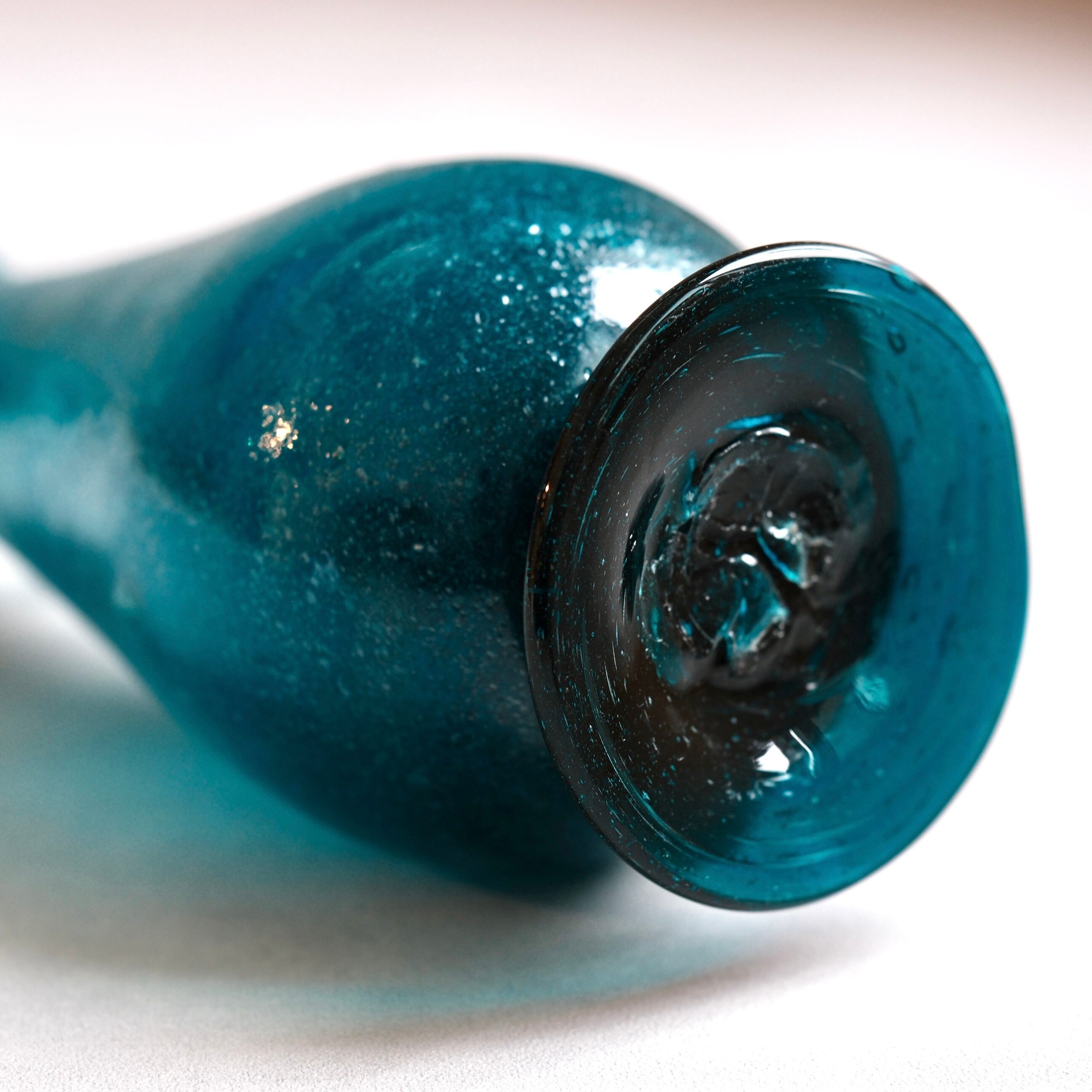 宙吹きによるハンドブロウで成形され、約1.3kgの肉厚なガラスならではの重厚感と、表面に残るゆらぎが手仕事ならではの魅力。深みのあるターコイズ色のガラスには微細な気泡が含まれ、光の当たり方によって豊かな表情を見せてくれます。底面にはポンテ跡(手吹きガラスを切り離す際に残る跡)が工房制作を物語る一点物。背が高くずっしりとした佇まいの為、枝物用の花器としてもお勧めです。オブジェとしても存在感があります。
