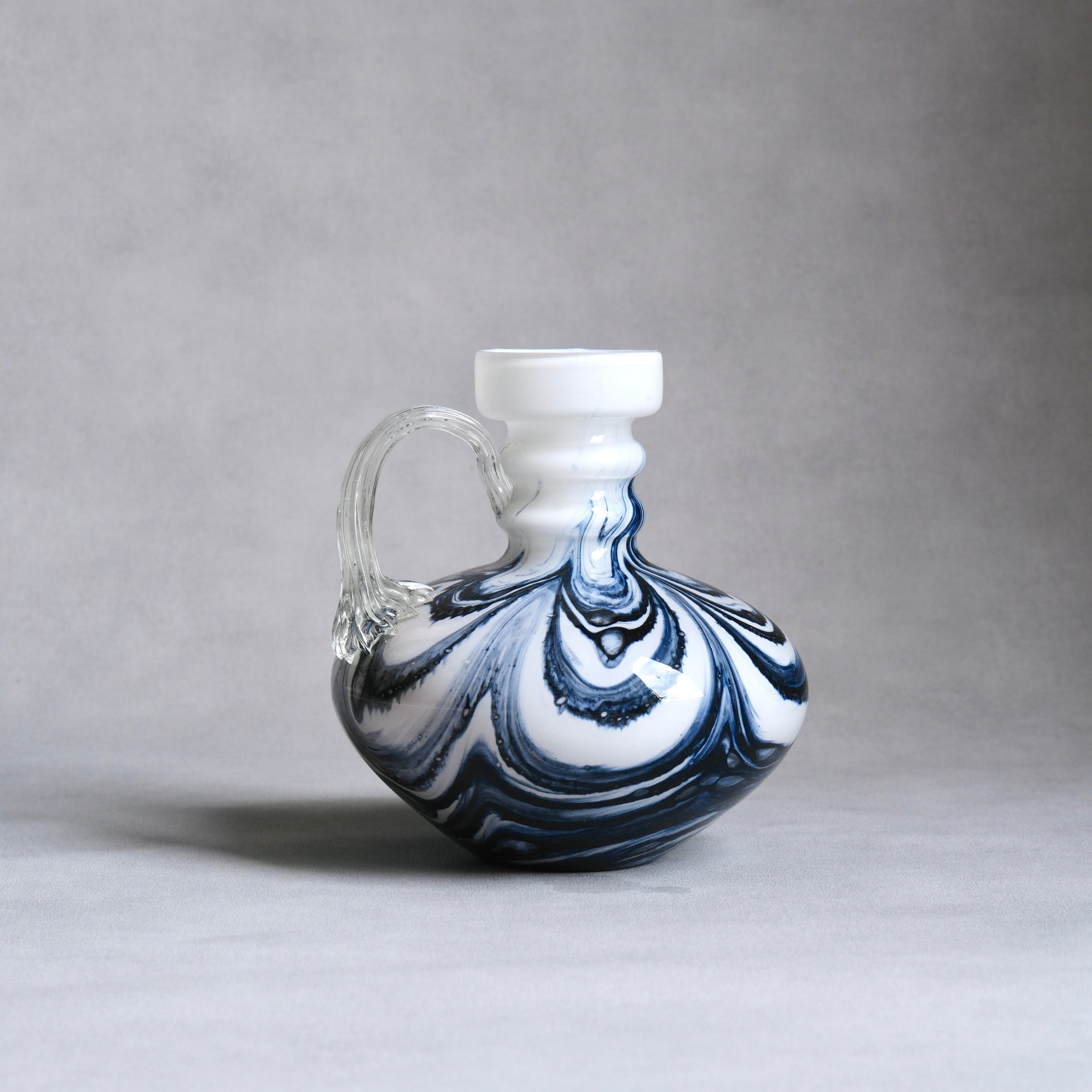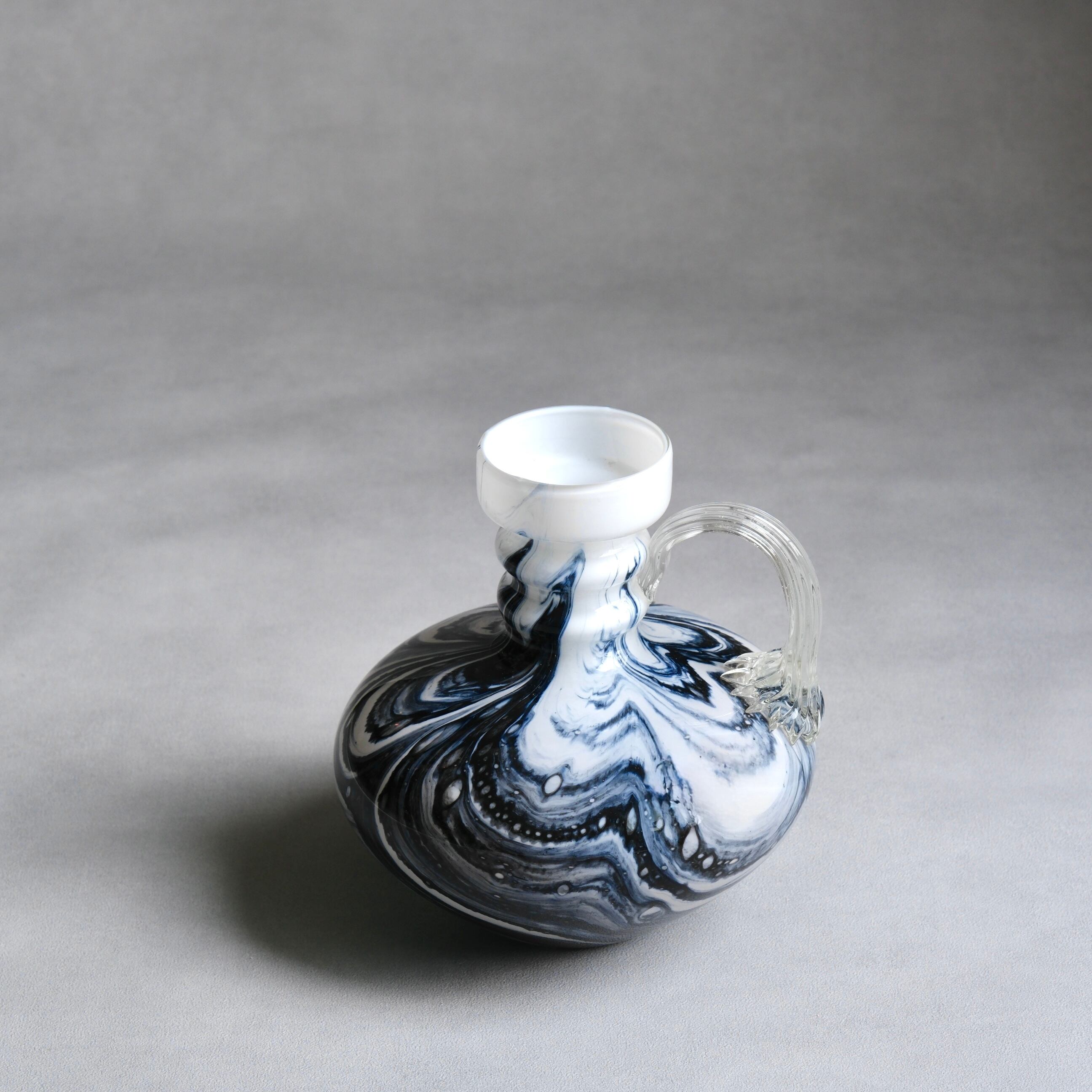 イタリア・ムラーノ島の名門ガラス工房 Carlo Moretti(カルロ・モレッティ)で製作されたフラワーベース。白をベースに、ネイビー〜ブラックのガラスが流れるように溶け合った、美しいマーブル模様が印象的な一点。職人の手仕事によって生まれる有機的なラインは、一つとして同じものがなく、ムラーノガラスならではの表情を楽しめます。丸みのある胴体と安定感のあるフォルムに、さりげなく添えられたクリアガラスのハンドルがアクセントとなり、実用性と造形美を兼ね備えたデザインです。