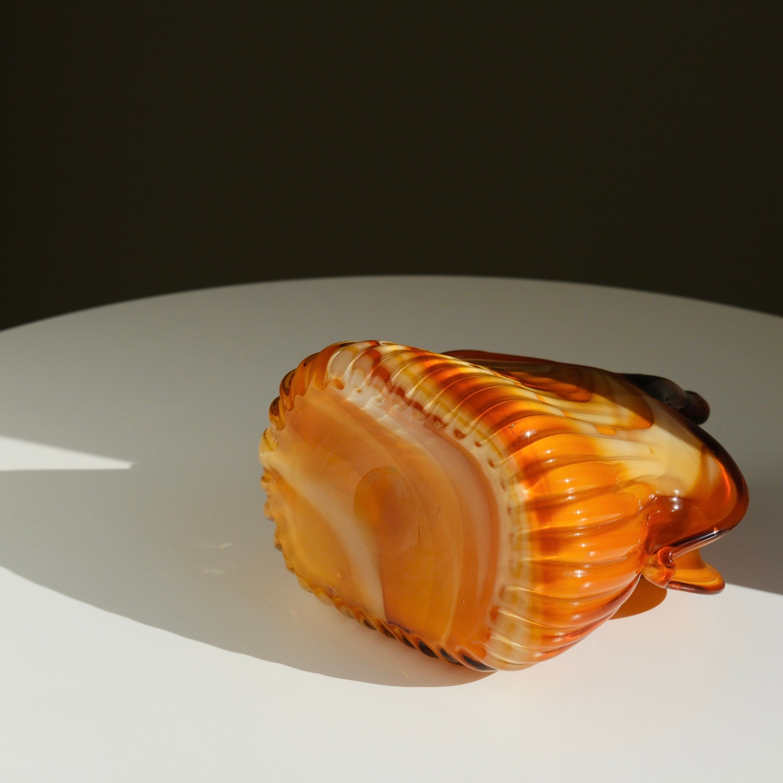 1950〜1960年代頃にイタリア・ムラーノ島で作られた、ころんとした丸みのあるフォルムが特徴のヴィンテージアートガラスのフラワーベースです。透き通った鼈甲色のガラスに、乳白色のガラスがゆるやかに混ざり合うマーブル模様が美しく温かみのある表情を見せます。ずっしりと重みがあり、分厚いガラスで作られているのでオブジェとしても存在感がありますが、勿論花器としても楽しめます。