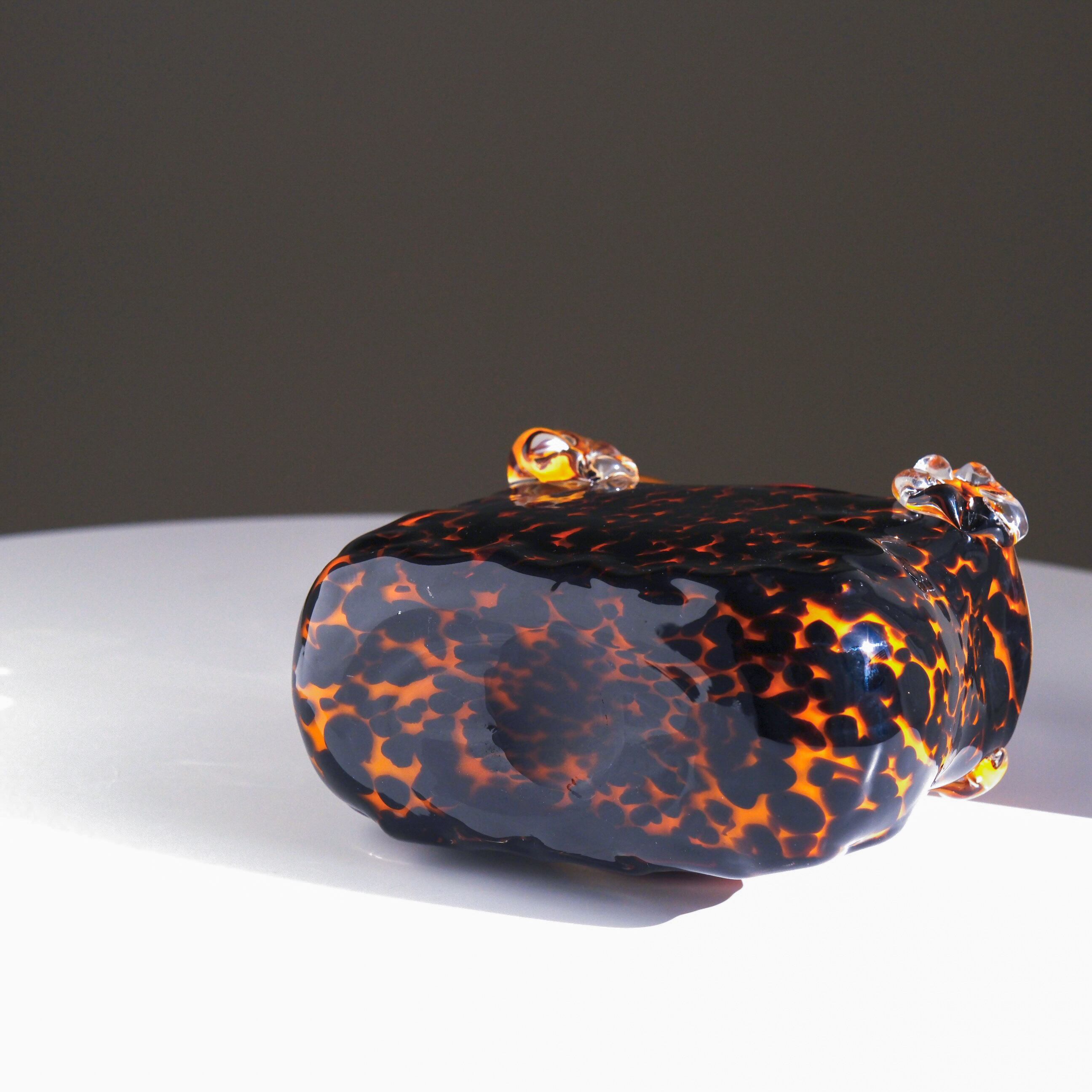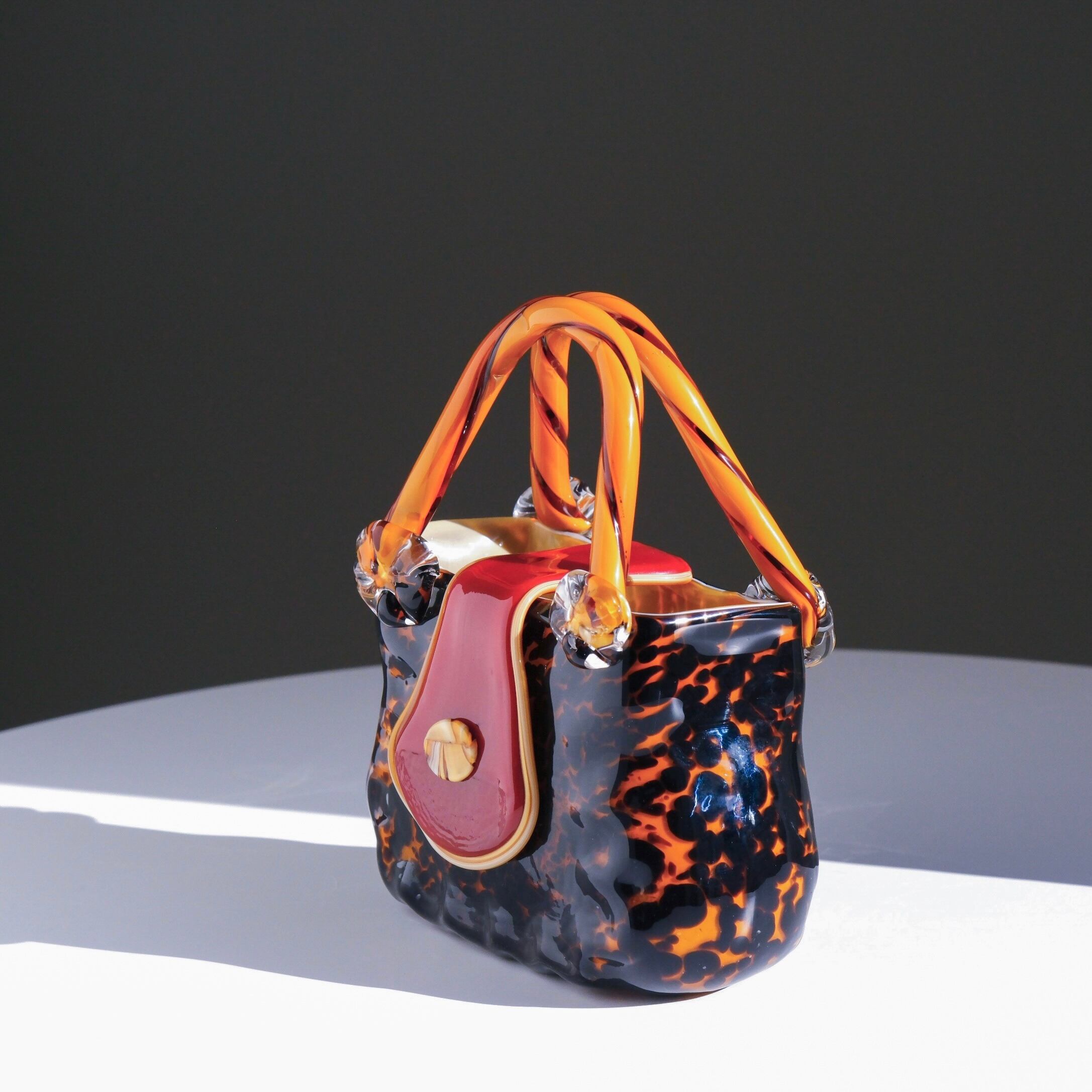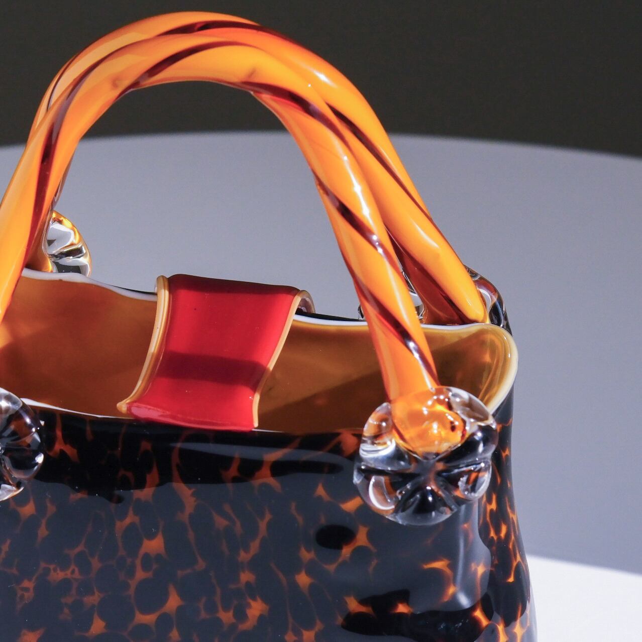 イタリアのムラーノ島で製作された、ミッドセンチュリー期特有の遊び心が融合した唯一無二のアートピース、人気のレオパード柄のハンドバッグ型フラワーベースが入荷しました。重厚感のある鼈甲色のボディに、ガラスで作られているとは思えない鮮やかなレッドのフラップやツイストハンドルがアクセントになっています。熟練の職人が一点一点手作業で仕上げているため、ガラスの厚みや色の混じり具合、ハンドルの曲線に至るまで、二つとして同じものは存在しません。欧米のコレクターの間でも非常に人気が高いアイテムです。当店でもこのシリーズは4度目の入荷ですが、どれも微妙に色合いやサイズが異なります。花器としてはもちろん、そのままオブジェとしても置くだけでインテリアを華やかに彩る主役級の存在感を放ちます。