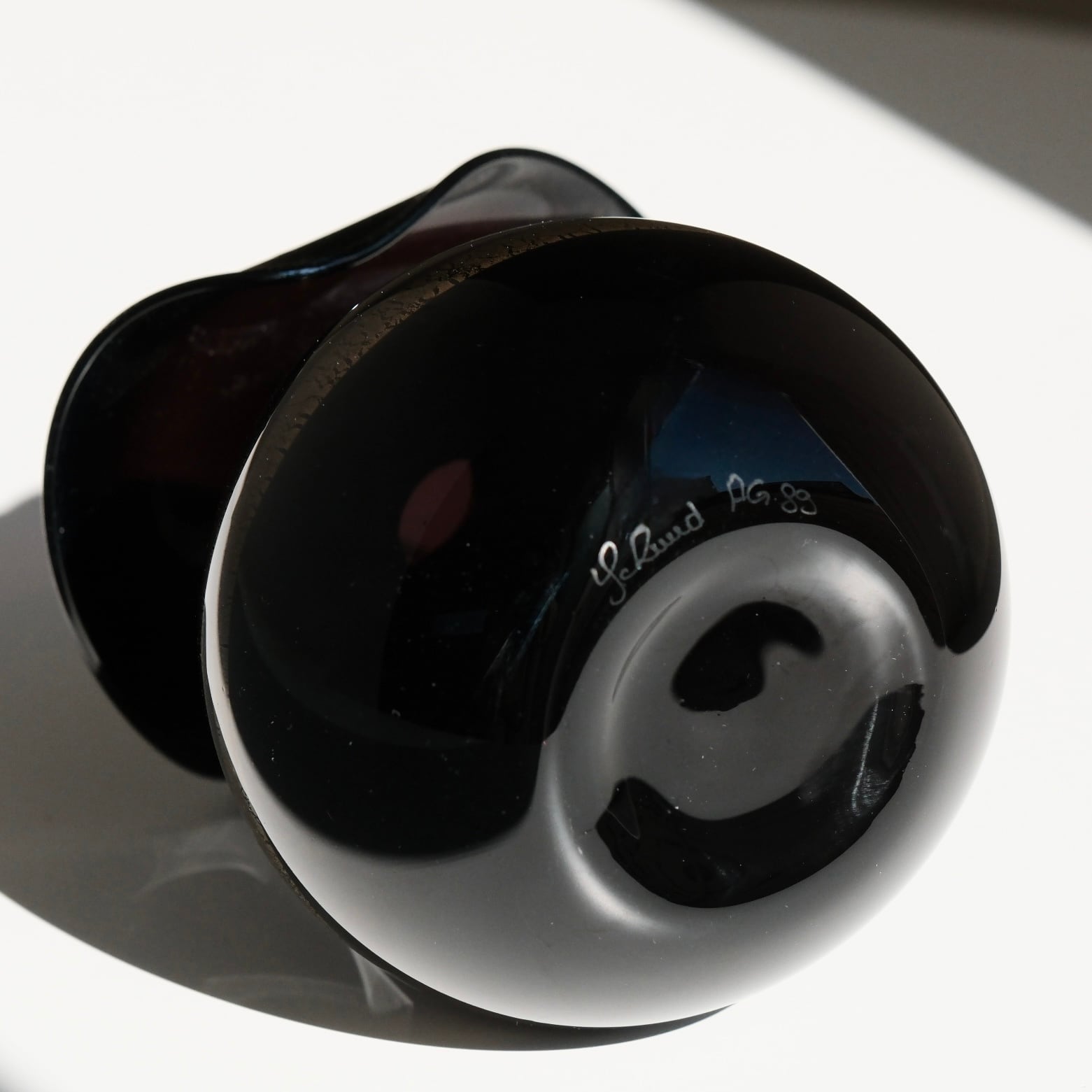 ドイツ・ラウシャガラスの伝統を現代芸術へと昇華させた巨匠、Ludwig Schmid(ルートヴィヒ・シュミット)によって、ベルリンの壁崩壊という激動の1989年に製作された至高のアートガラス花瓶。底面には薄く作家自らの手による貴重な直筆サインと製作年が刻まれています。一見黒に見えるボディは、光に透かすと深いアメジストカラーのガラスで作られていて、幾重にも重なる黄金のラインが美しいアクセントになっています。この繊細な金彩は、作家が得意とする「ランプワーク」技法により、高熱の炎の中で一瞬の隙もなく施されたものです。羽のように軽く、極限まで薄く仕上げられたガラスの質感は、手にした瞬間に職人の卓越した感性と技を実感させてくれます。