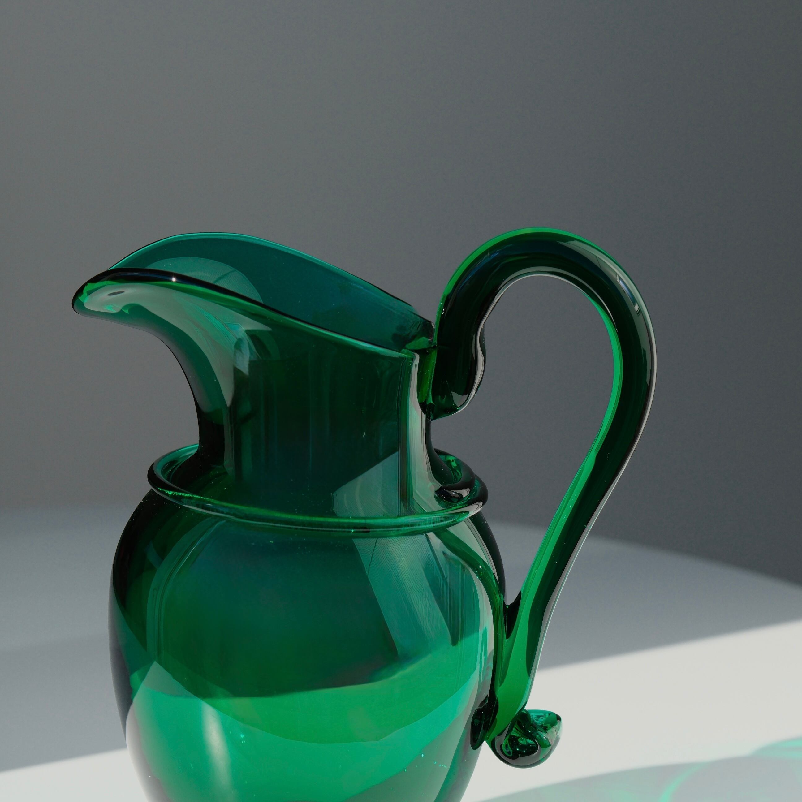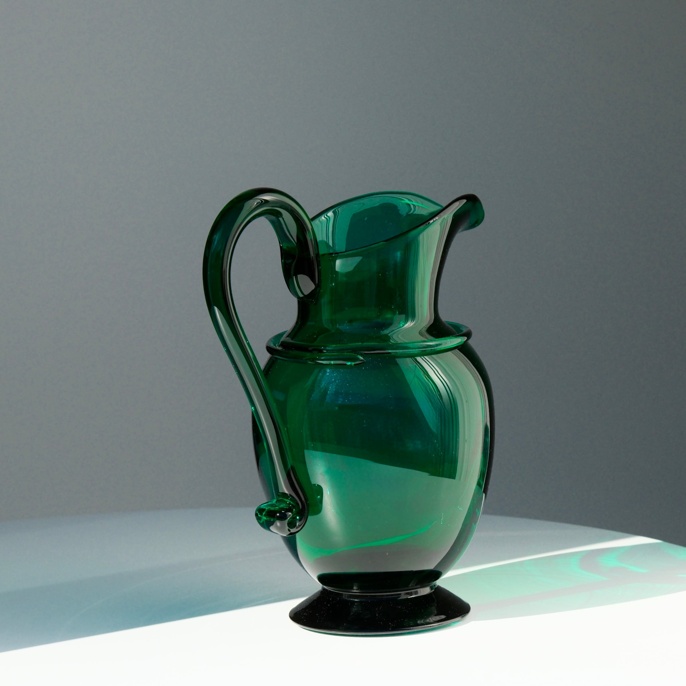 このモデルとなったのは、1800年代半ばのアメリカで愛されていた「サラトガ・ガラス」。当時のミネラルウォーターのボトルに見られた神秘的なエメラルドグリーンの発色を、ポルトガルの熟練した職人が一点一点、手吹きガラスの技法で忠実に蘇らせました。優雅な曲線を描くハンドルの美しい造形や、接合部の繊細な装飾、そして底面に残された手仕事の証である「ポンテ跡」から、当時の高いクラフトマンシップが感じられます。現代の大量生産品には決して出せない、ガラス特有のわずかなゆらぎや気泡は、光を透過させることで宝石のような輝きを放ち、窓辺に置くだけでその空間に圧倒的な気品をもたらします。ずっしりと重厚感があるため、花器としてもオブジェとしても美しい存在感のある1点。現在は製造されていない希少なヴィンテージ品であり、市場でも滅多に出会うことのないコレクターズアイテムです。