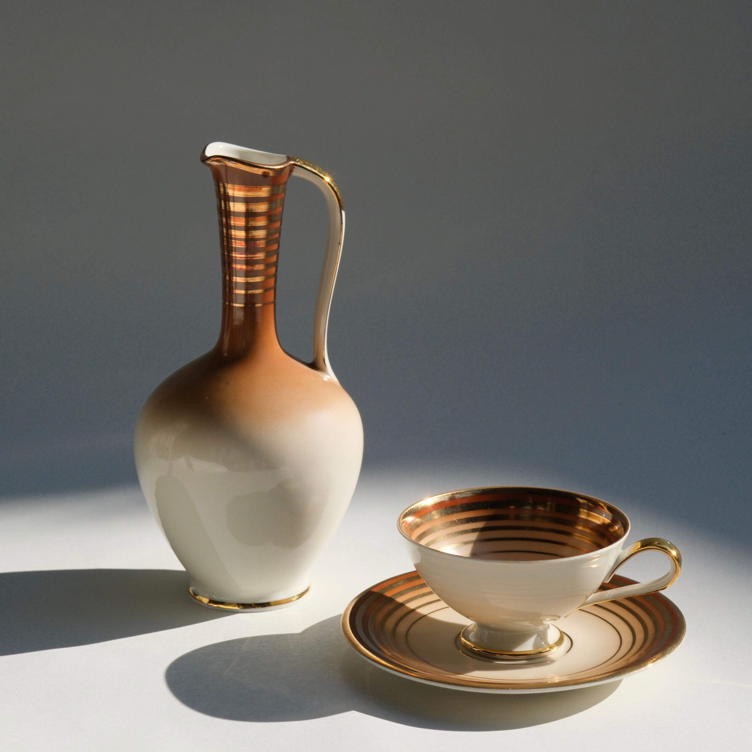 ドイツの磁器メーカーMitterteich Bavaria (ミッターテイヒ・バヴァリア)によって作られたヴィンテージのモカカップ&ソーサーとミルクジャグのセット。やわらかなアイボリーの磁器に、銅色のグラデーションと繊細なゴールドラインが重なる、ミッドセンチュリーらしい上品なデザインです。小さなモカカップは、エスプレッソやデミタスコーヒーに。ミルクジャグは、一輪の花を飾る小さなフラワーベースとしてお使いいただくのがおすすめです。希少な良好コンディションでのお揃いのセットです。