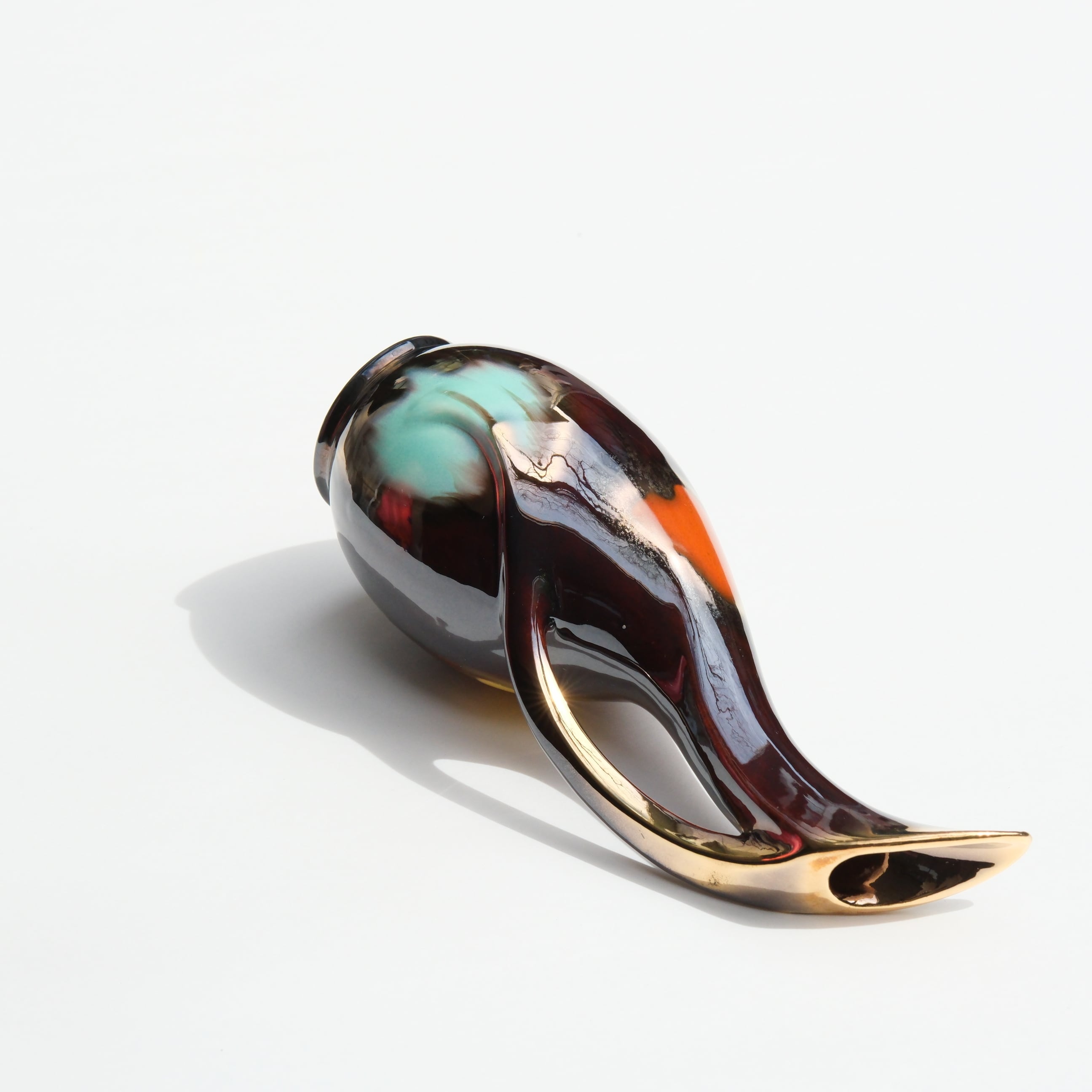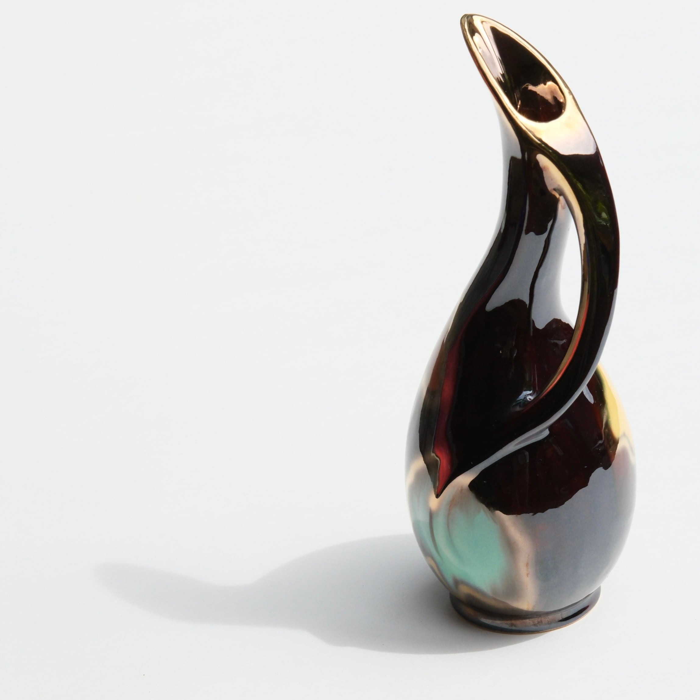 1960年代頃に西ドイツで製作された、Üebelacker Keramik社製のセラミックベース。有機的に立ち上がるフォルムと、一体化したような流れるハンドル、彫刻のようなシルエットが印象的な一品です。深みのあるブラウンをベースに、口元に施されたゴールドの装飾や、赤や黄色、ターコイズの釉薬がアクセントになっています。一輪挿しとしても、オブジェとしても。