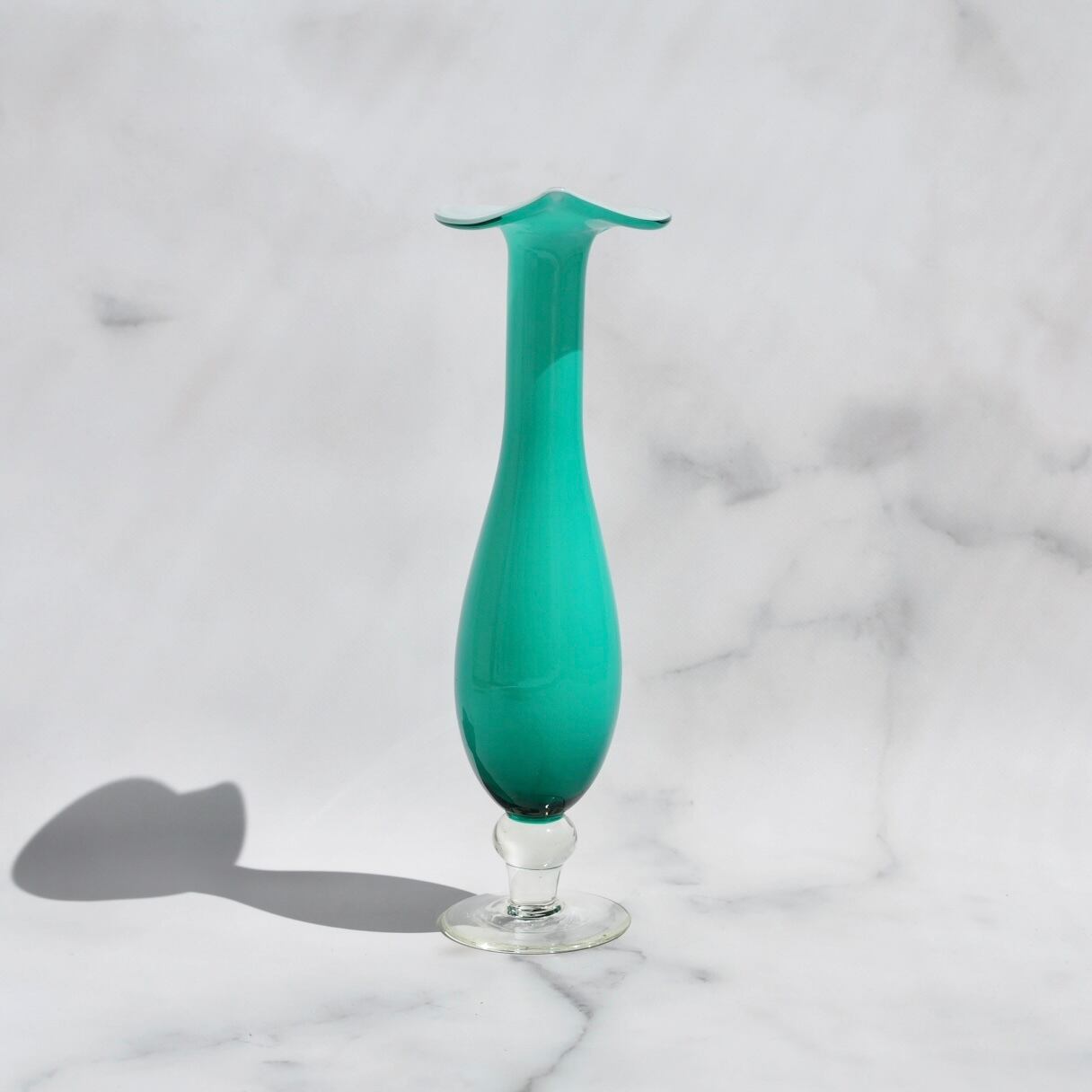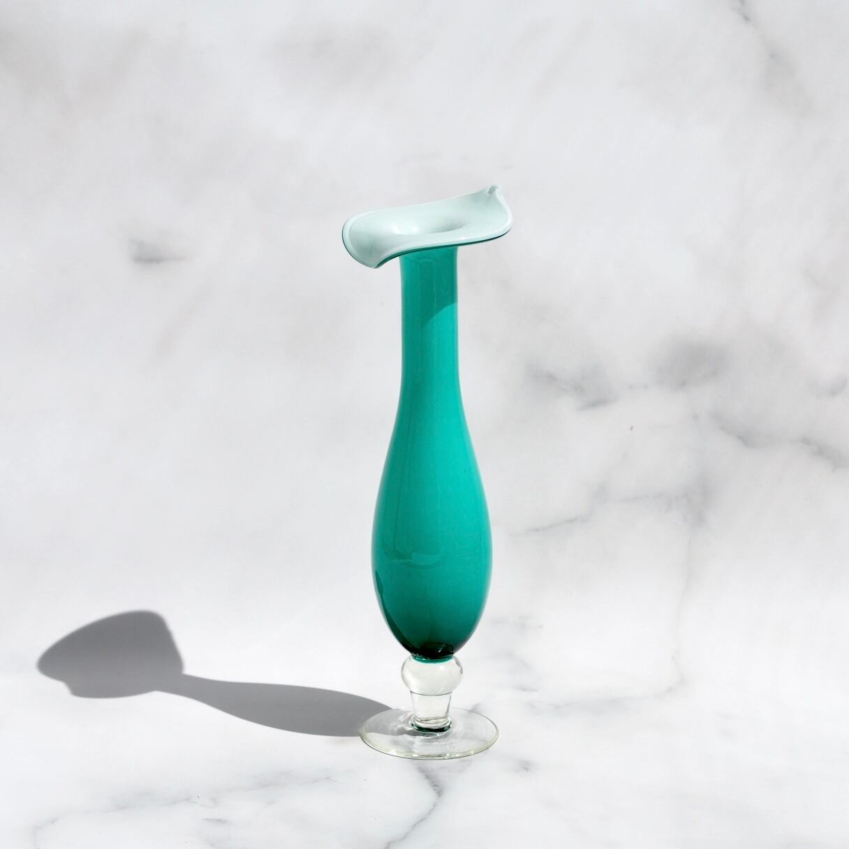 どこかトロピカルな雰囲気を漂わせるカラーと曲線的なボディが美しいopaline glassのフラワーベース。フランスで買い付けた1980年代頃の作品です。外側の鮮やかなグリーンと内側のホワイトの配色がとても爽やかな1点。