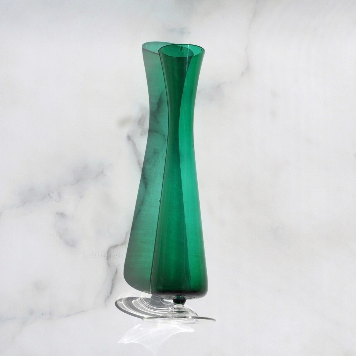 フランスで買い付けたヴィンテージガラスの花瓶。透き通った色鮮やかなグリーンと薄く繊細なガラス素材がお花をより一層引き立ててくれそうです。