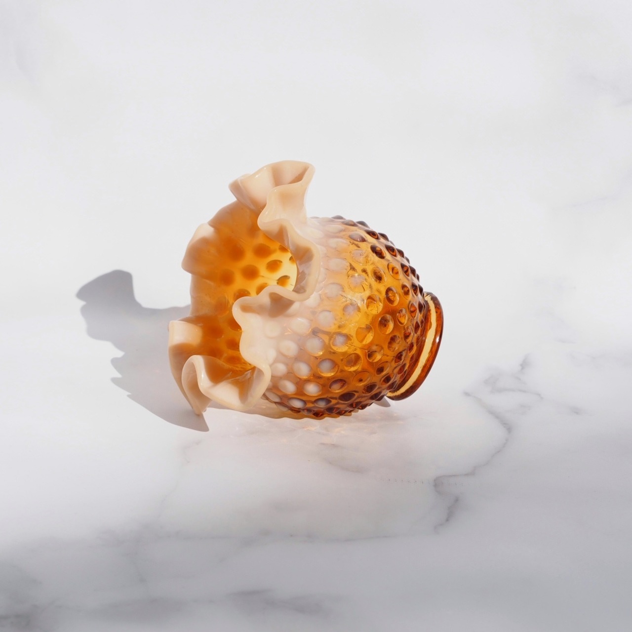 Fenton Art Glass Companyのフラワーベース。突起が靴底の鋲に似ていることから名付けられた、こちらのHobnail(ホブネイル)シリーズは、同社にとって代表的なシリーズ作品。丸いコロンとしたシルエットに、カメオの様なピンクベージュとアンバーの組み合わせが美しい作品。キャンドルホルダーとしても◎