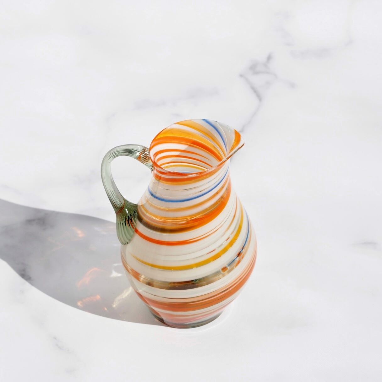 オレンジを基調としたレトロな雰囲気が可愛いガラスピッチャー。取手部分のデザインもポイントです。約17cm程の程よい大きさも魅力。