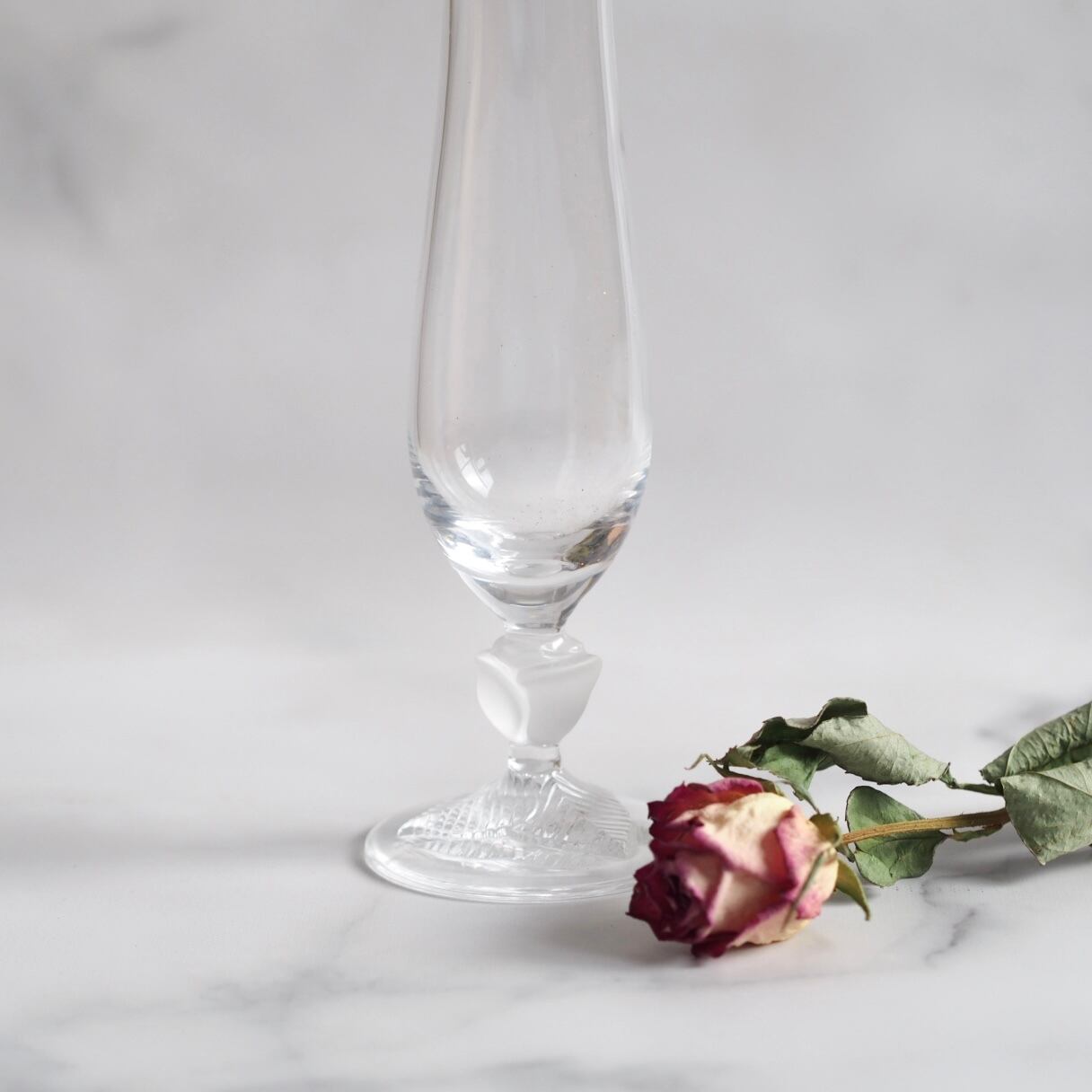 脚部分にはバラの花、ボトム部分にはバラの葉のデザインが施されたクリアガラスのフラワーベース。透明度の高いクリアなガラスが洗練されたデザインをより一層引き立てます。一輪挿しとしても、オブジェとしても◎