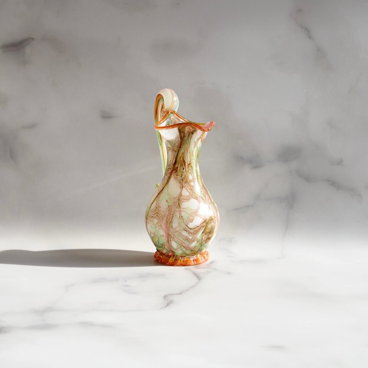 乳白色のガラスにオレンジ、ブラウン、グリーンなどのカラーで装飾されたガラス製ピッチャー。ヴィンテージガラスならではの色合いに美しいシルエットがマッチしたレアな1点です。