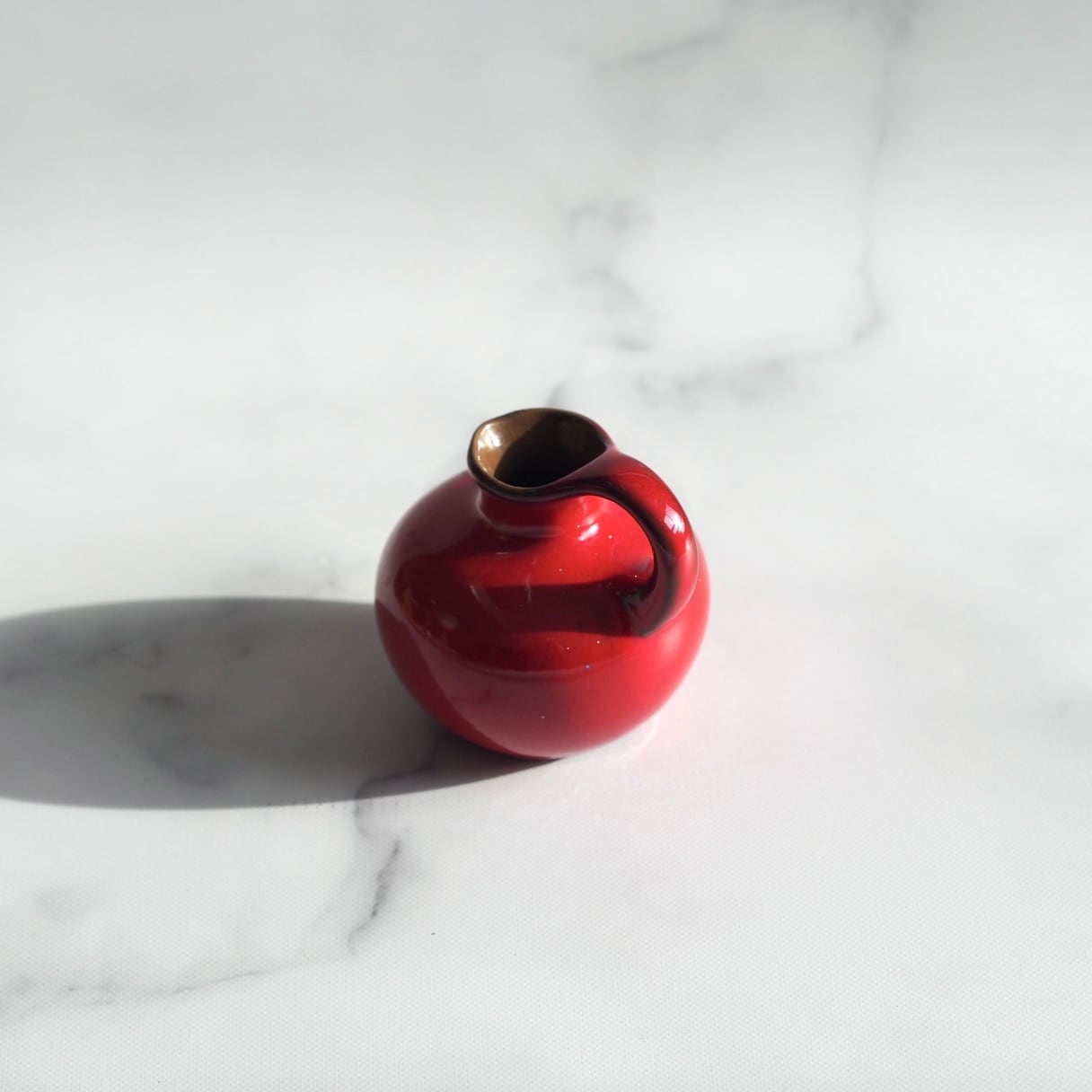 1950年代頃の西ドイツで作られたGräflich Ortenburg'sche社製のフラワーベース。艶のある力強い赤とコロンとした丸いシルエットは小さいながらも存在感のある1点です。食卓やデスクに置いても邪魔にならない手のひらサイズも魅力。