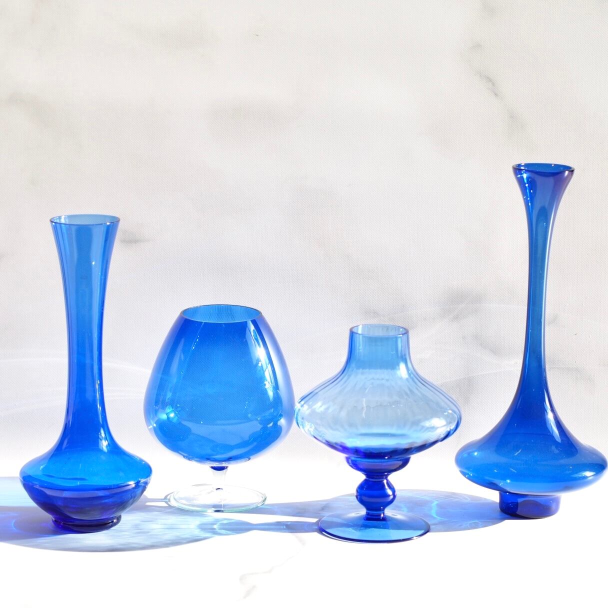 ドイツ中央に位置するチューリンゲン州の森の中にある小さなガラスの町、ラウシャで作られた手吹きガラスのフラワーベース。鮮やかなブルーのガラスにとても美しいシルエットです。同じラウシャ製のガラスで作られた作品達と並べてオブジェとしても。