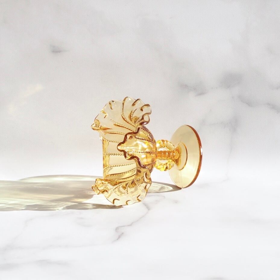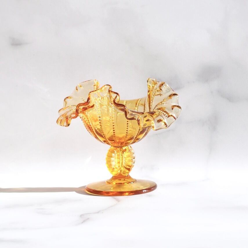 Fenton Art Glass Company社によって作られたキャンディーディッシュ。繊細なラッフルのデザインとステム部分の丸いポコポコしたデザインが特徴です。オブジェとしては勿論、ジュエリーなどの小物入れとしても◎