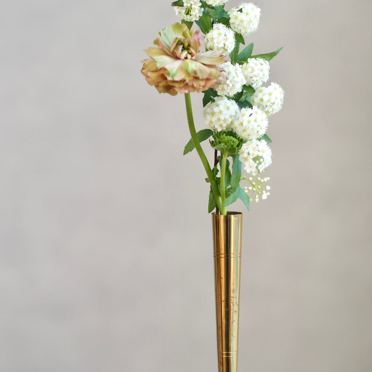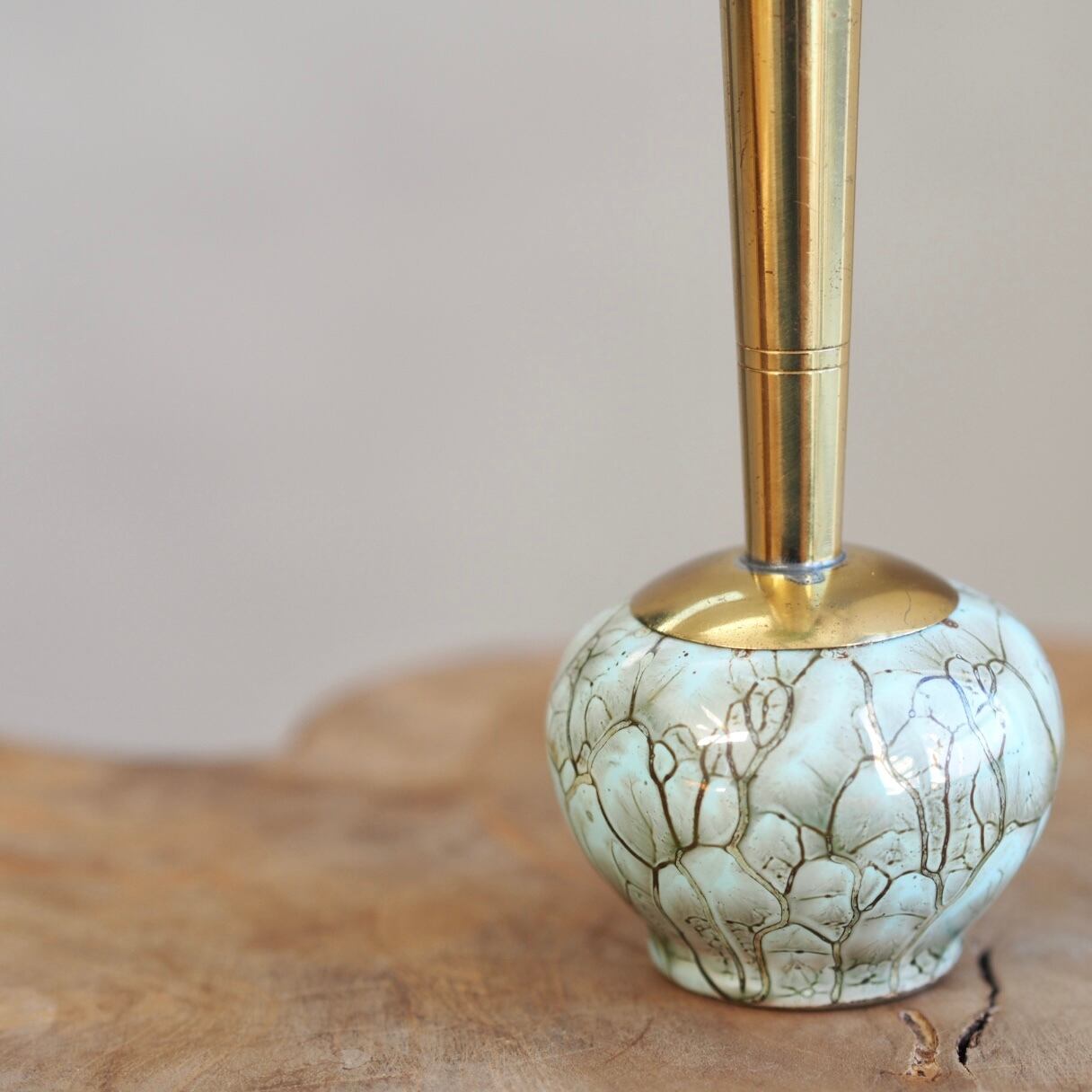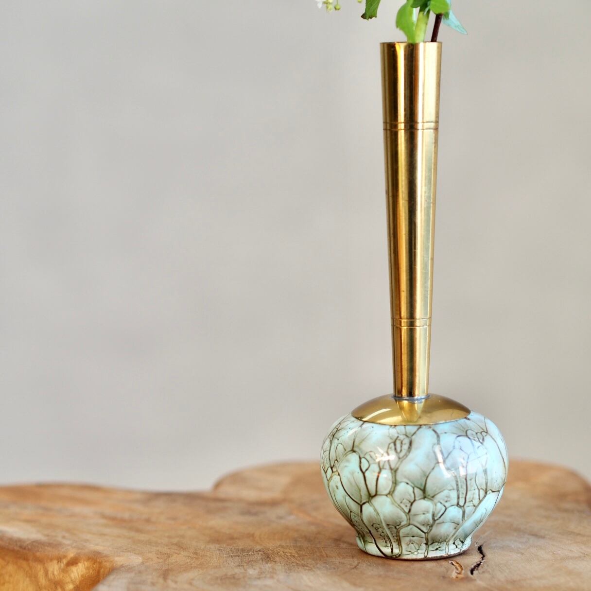 オランダ製の真鍮と陶器で作られたスリムなスタイルのフラワーベース。ゴールドにターコイズの色合いが上品な雰囲気です。デスクなどの小さなスペースに置くのにちょうどいいサイズ感。一輪挿しやペンスタンドとしても。