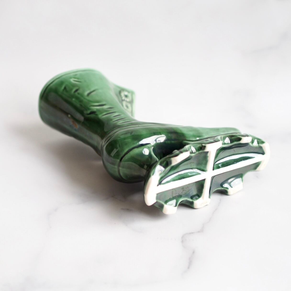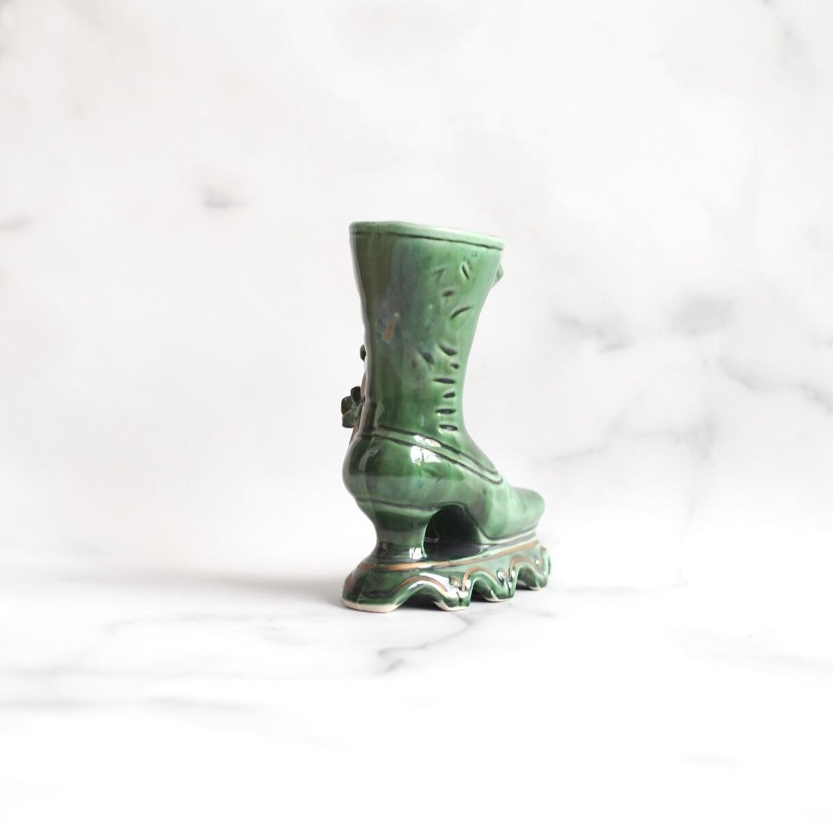 艶のあるモスグリーンにゴールドのシャビーシックなフラワーモチーフが付いた磁器製のシューズ型フラワーベース。ユニークなデザインと渋い色合いが雰囲気のある1点です。