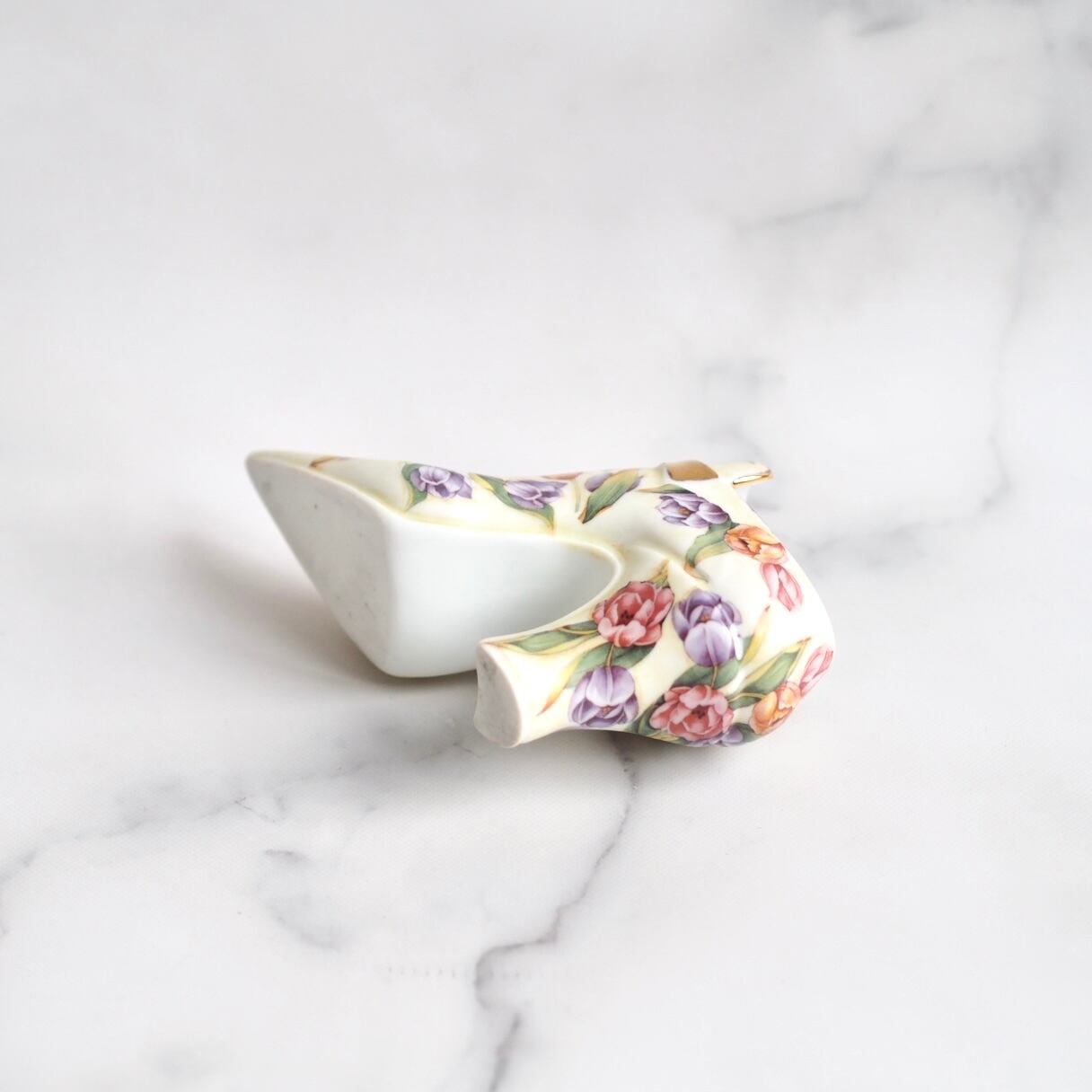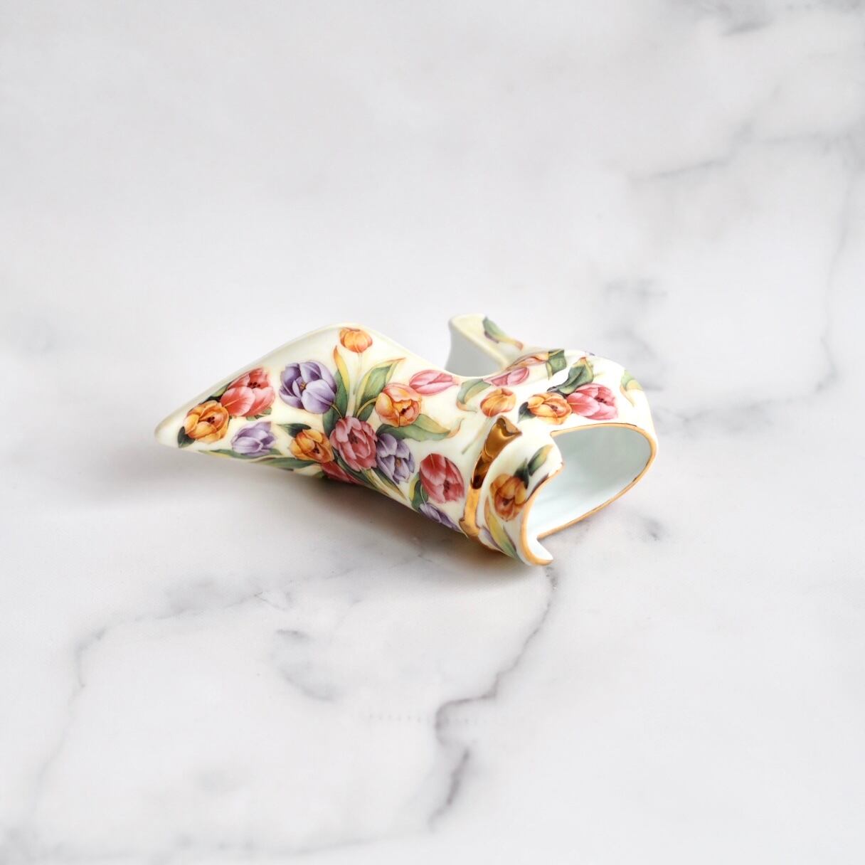 カラフルなチューリップが描かれた磁器製の小さなシューズ型フラワーベース。縁部分のゴールドの装飾がエレガントな雰囲気です。オブジェとしても場所を取らない手頃なサイズも魅力。