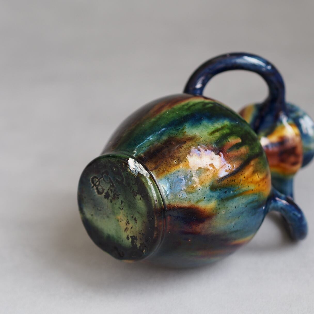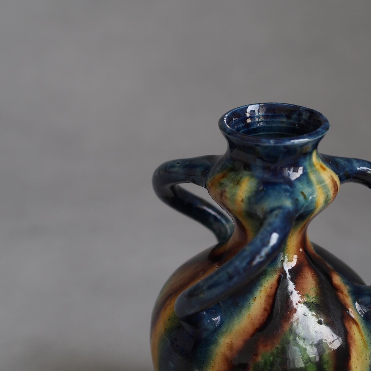 1930年代頃に制作された、ベルギーの北西に位置する西フランドル州の州都、「天井のない美術館」と称される中世の商業都、Bruges(ブルージュ)で製作された陶器製フラワーベース。3つのハンドルがついたユニークなデザイン。独特なカラーリングとシルエットはオブジェとしても存在感があります。メーカー等は不明ですが、底面には「658」と刻印されています。