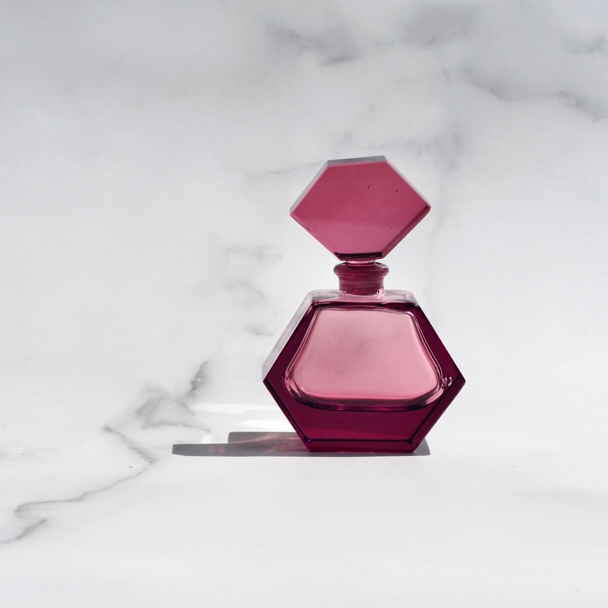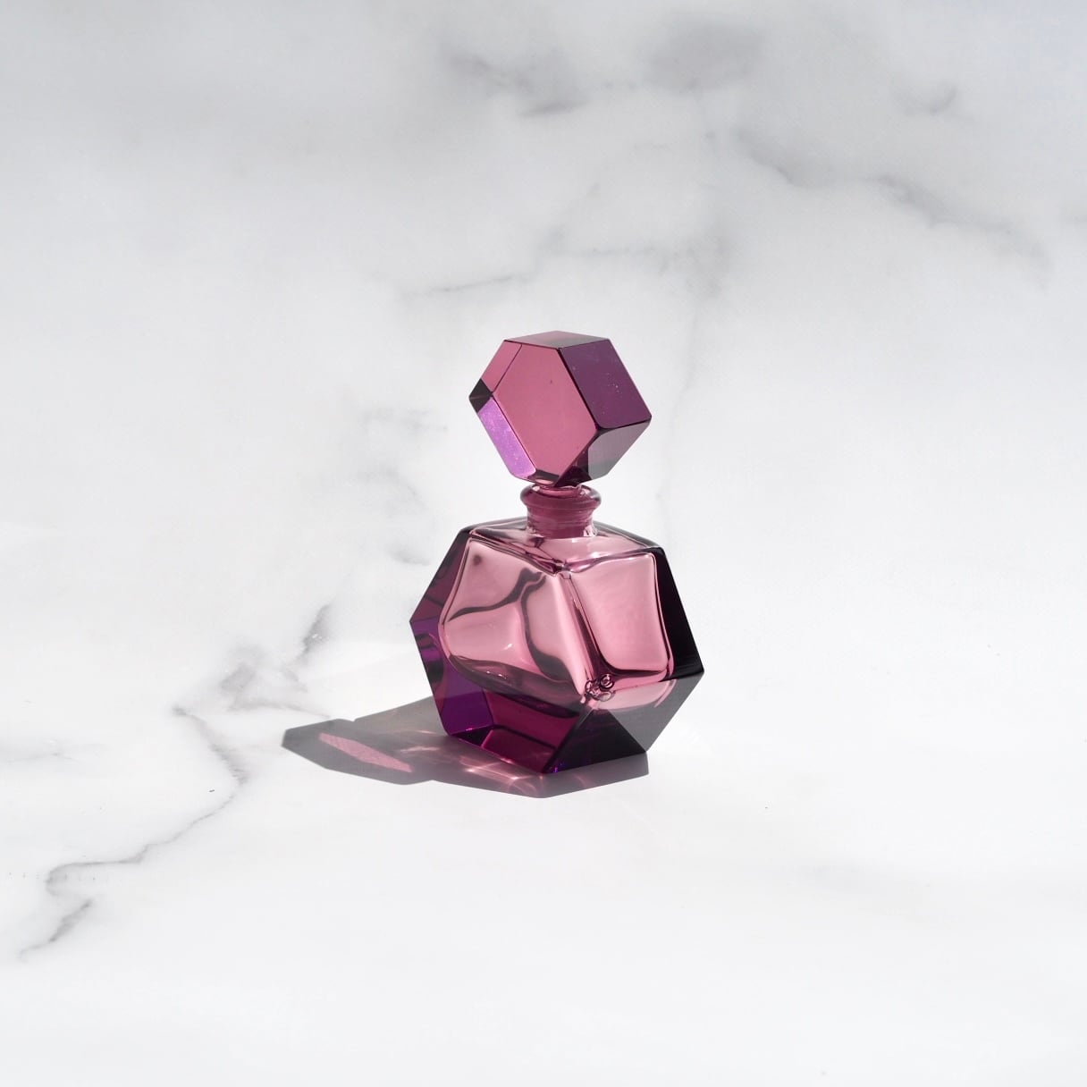 宝石のようなカッティングと深いアメジストカラーの美しいクリスタルガラスで作られたパフュームボトル。色、サイズ感、フォルムの全てが絶妙にマッチした希少な1点です。お気に入りの香水を入れてお楽しみ下さい。ギフトにもお勧めです。