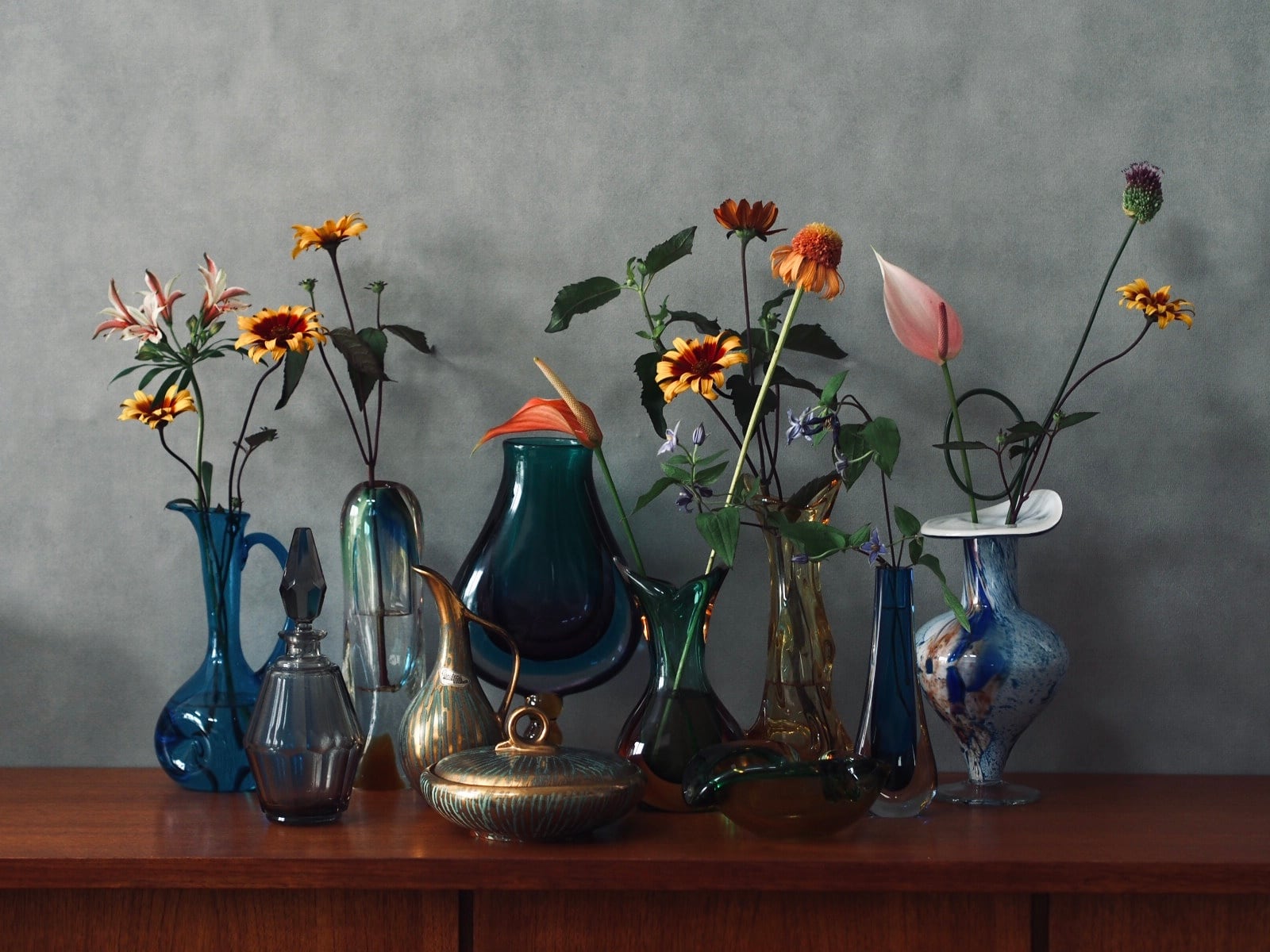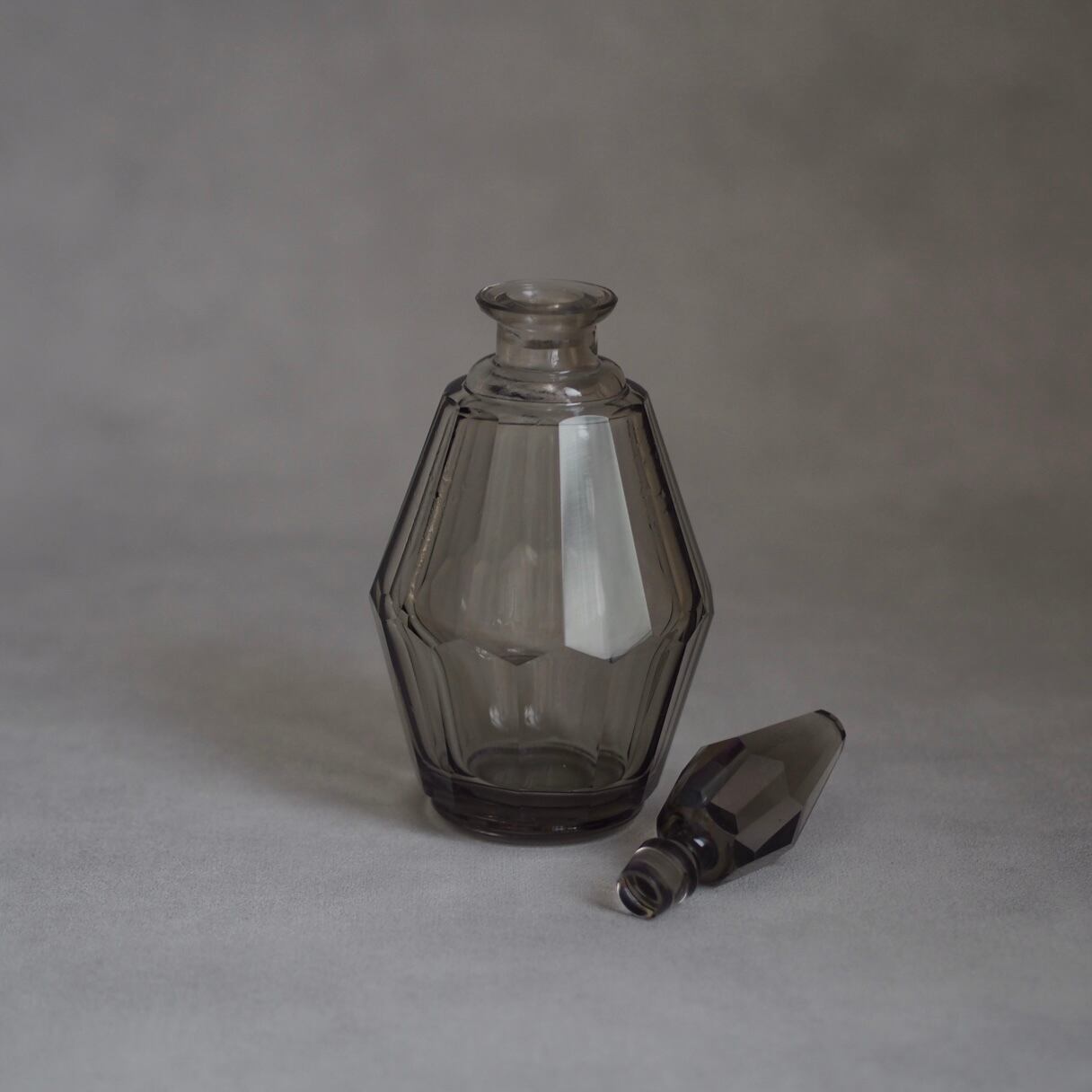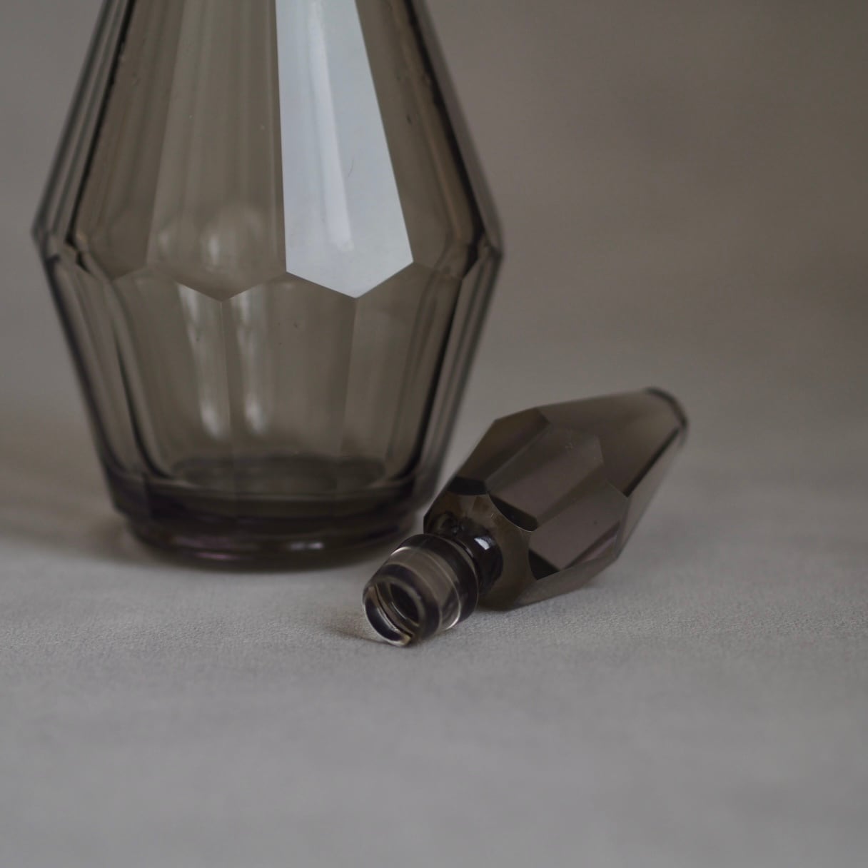 絶妙なグレージュカラーのガラスで作られた大きいサイズのパフュームボトル。宝石の様なカッティングと落ち着いたスモーキーな色合いがとても上品な1点。インテリアのオブジェとしてはもちろん、ストッパーを外して花器としてもちょうどいいサイズ感です。