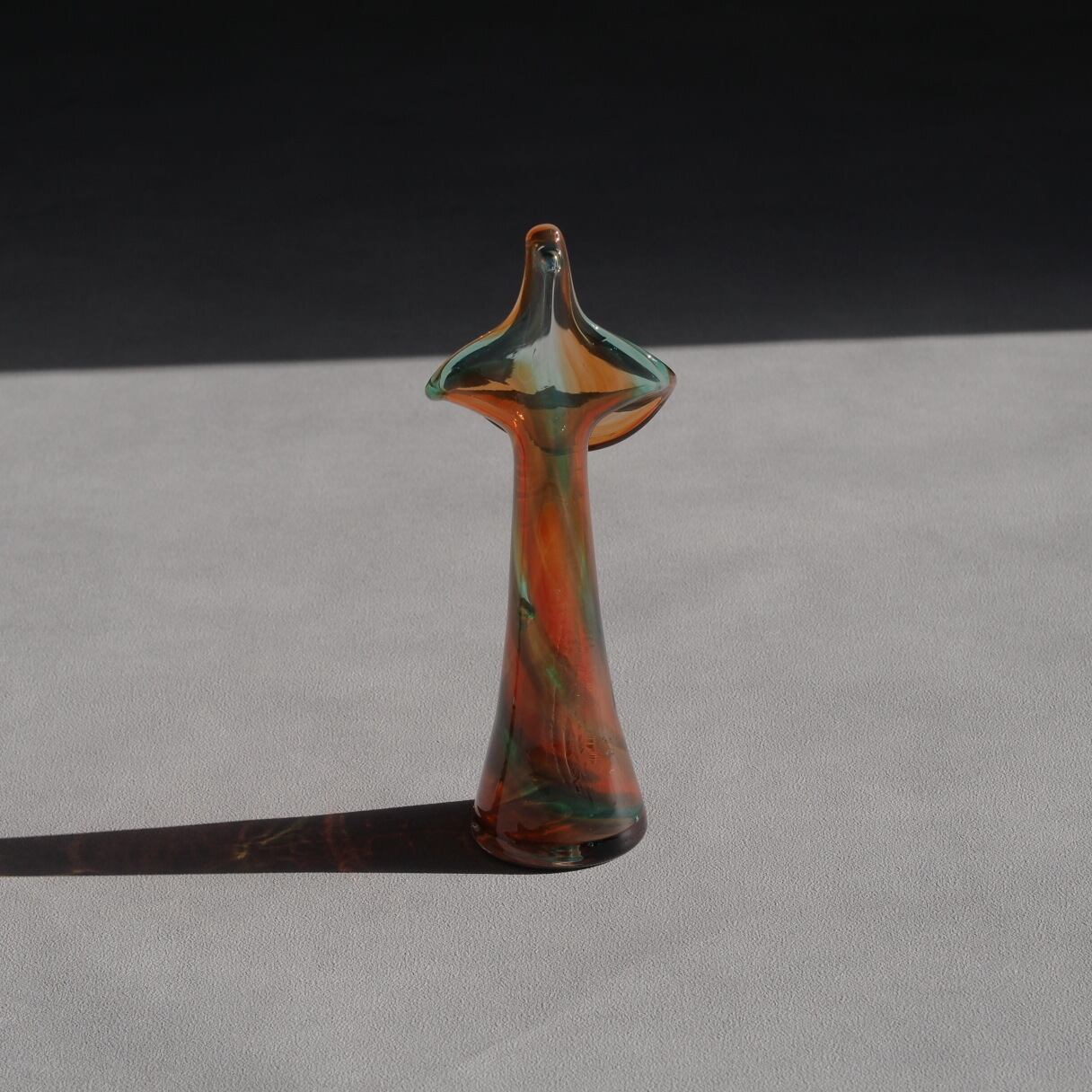 アメリカから届いた手吹きガラス製のフラワーベース。オレンジと淡いグリーンのコントラストが美しい1点です。オブジェとしても。