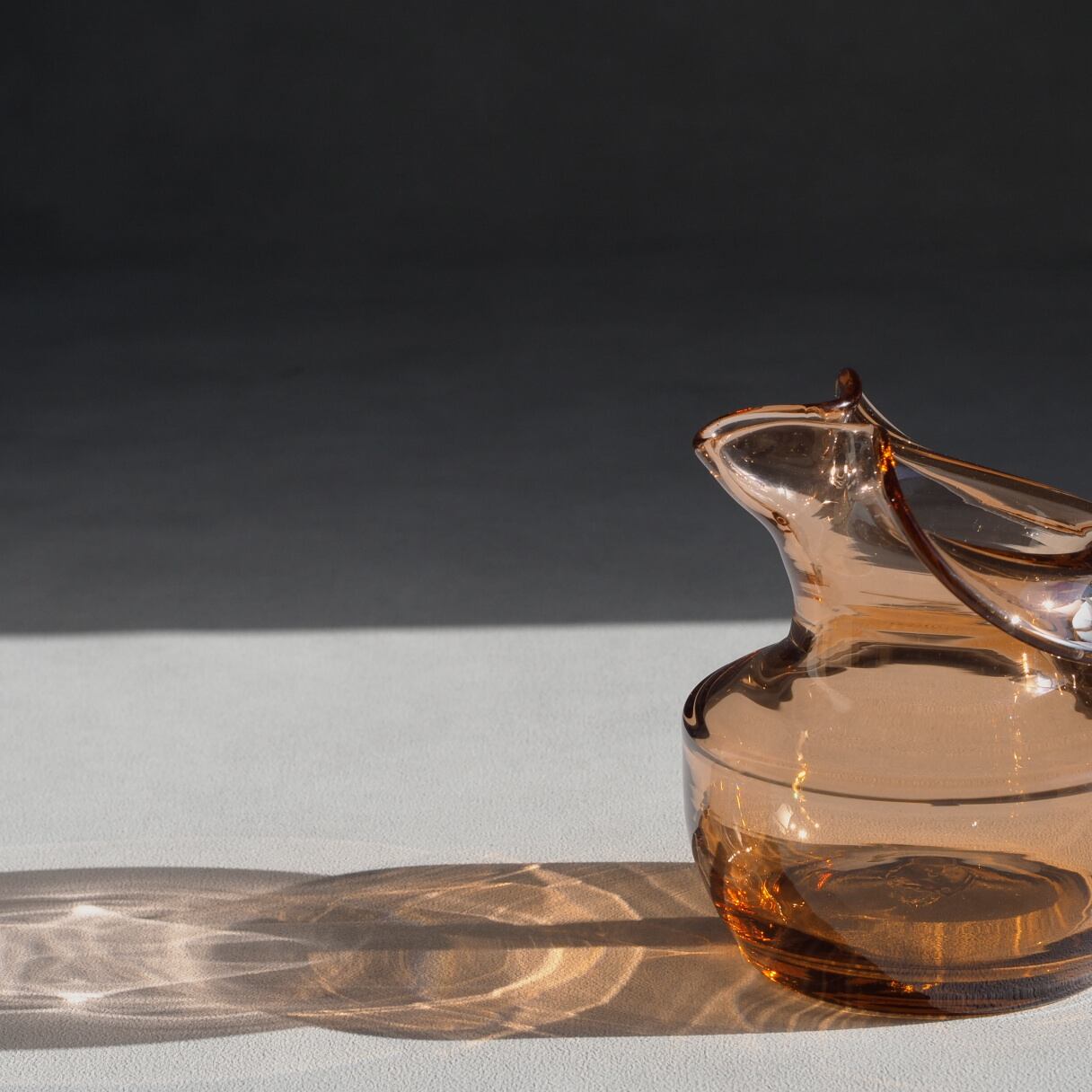 アメリカで作られた手吹きガラス製のフラワーベース。艶やかなアプリコットカラーが可愛いらしく、外側に折り返された注ぎ口部分はハンドメイドならではの味わいです。ずっしりとした重厚感のある1点。