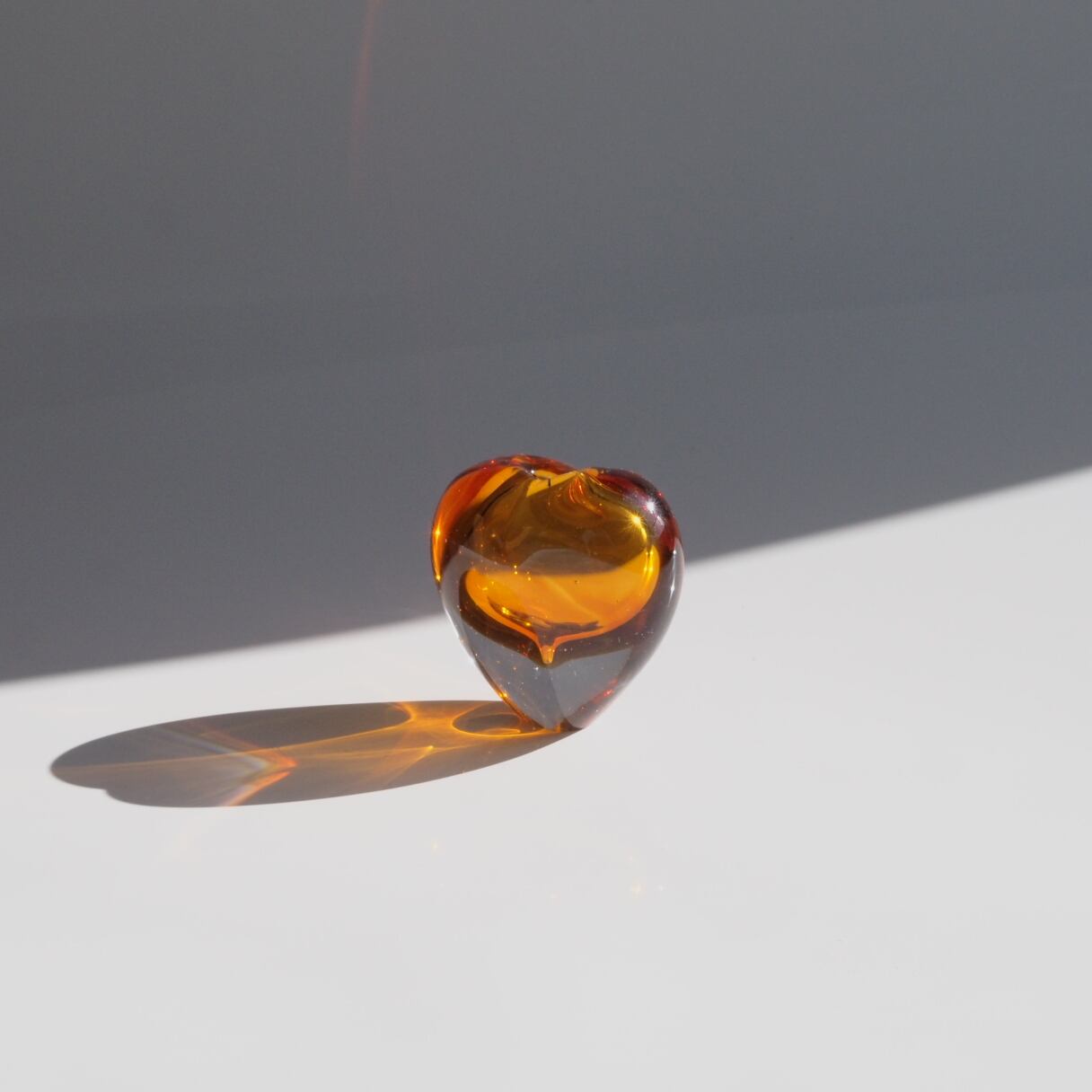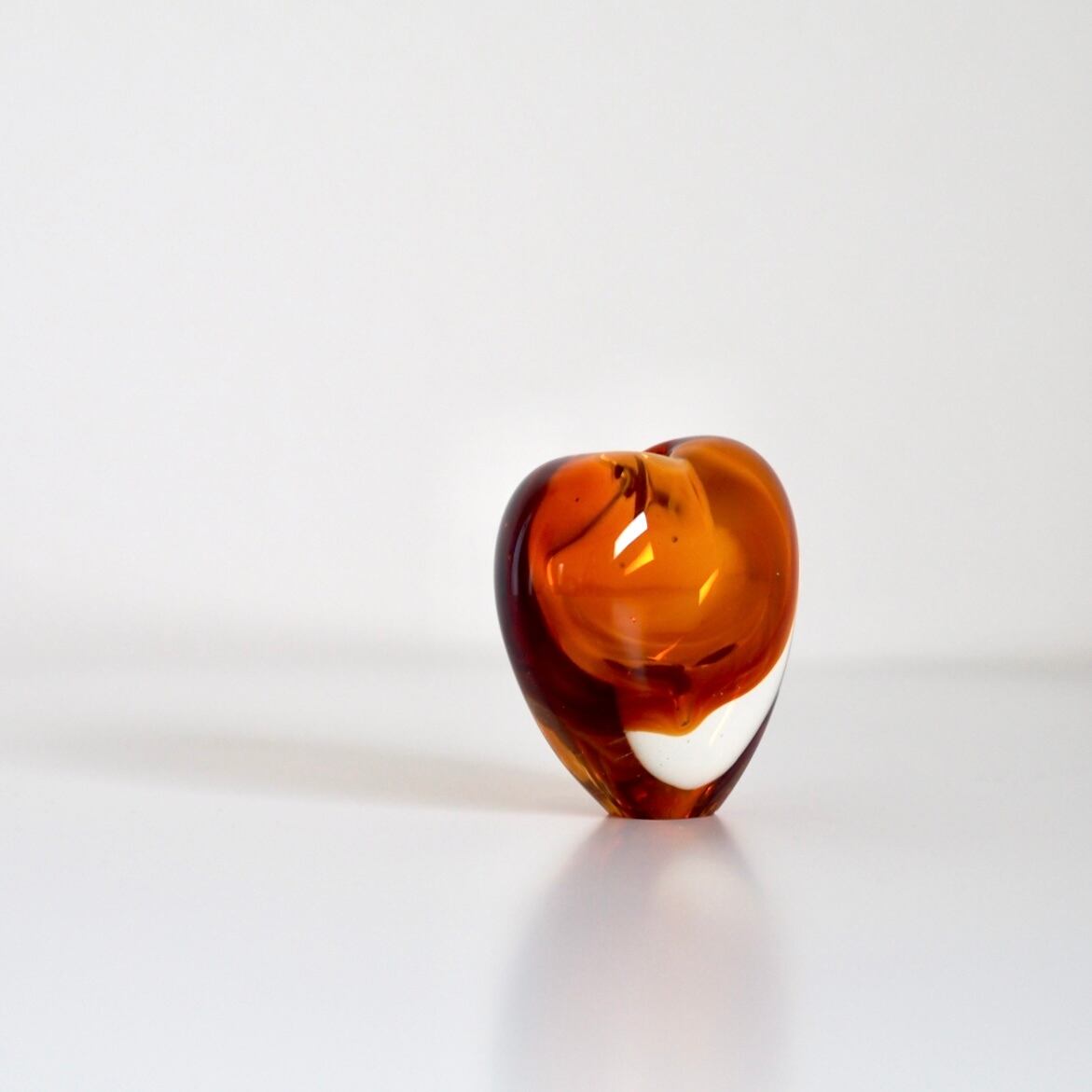 クリアのガラスに沈められたアンバーの色合いが美しい小さなハート型のフラワーベース。一輪挿しやオブジェとして、またはペーパーウェイトとしても。是非光の入る窓辺に置いてお楽しみ下さい。