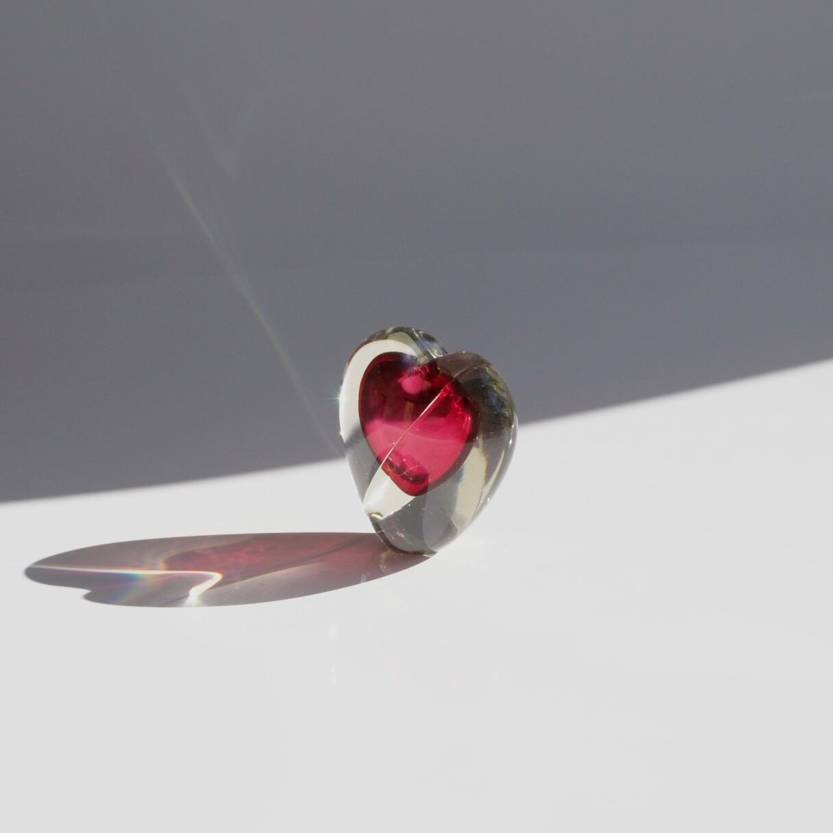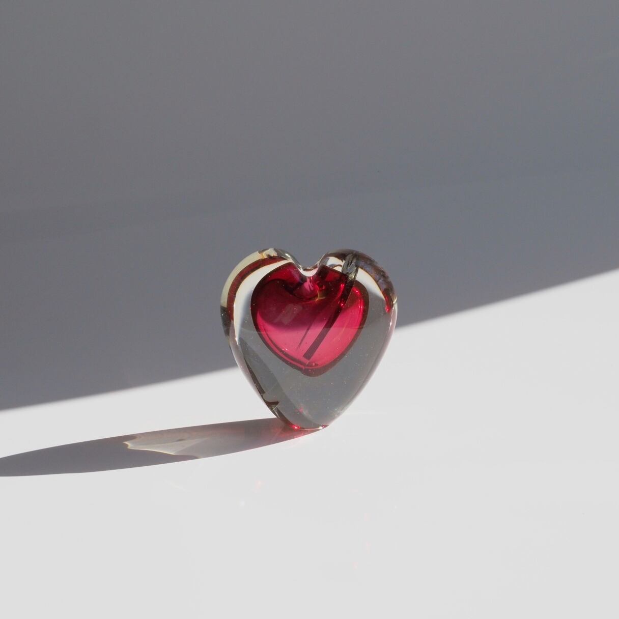 分断された2つのパーツから構成されたハート型の小さなガラス製フラワーベース。透明度の高いクリアのガラスの中に沈められたクランベリーカラーの色が美しく、とても希少なデザインです。オブジェや小さな一輪挿しとして、またペーパーウェイトとしても。