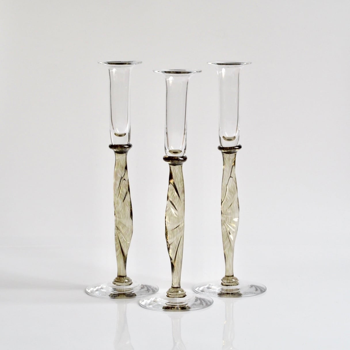 デンマークで仕入れたガラス製キャンドルホルダー。ほんのりカーキ色に色付いたステム部分が雰囲気のある1点。短くなったお花を入れて一輪挿しとしても。
