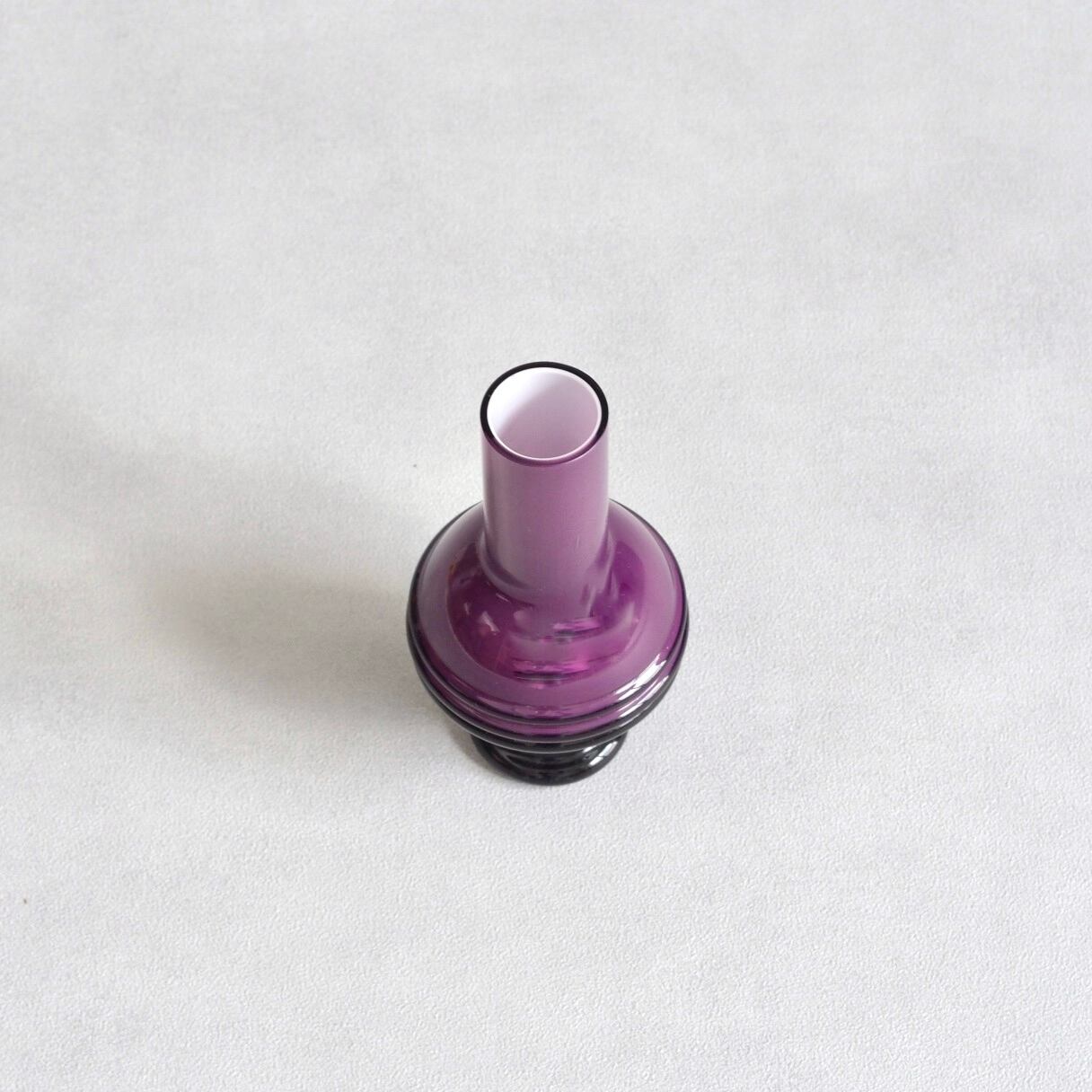 デンマークで仕入れたパープルとホワイトの二層のガラスで作られた1970年代のフラワーベース。丸いシルエットと艶のある深いパープルの色合いが美しい1点。手頃なサイズ感も魅力。