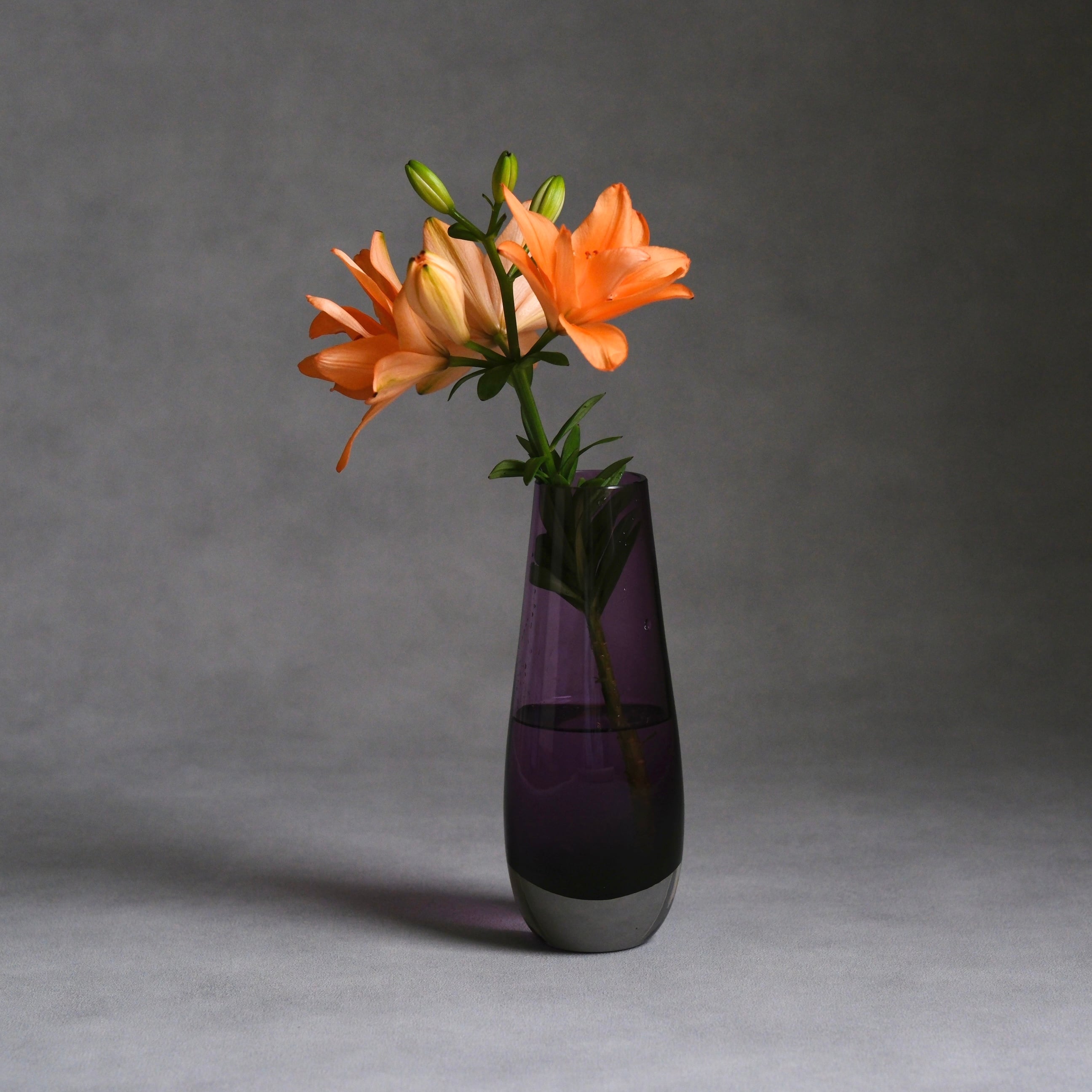 スウェーデンのアートガラスデザイナー、Bo BorgströmがスウェーデンのÅseda社でデザインしたフラワーベース。 ミニマルなフォルムにアメジストカラーのシックな色合いが美しい1点です。ずっしりと重厚感のある素材で安定感があります。